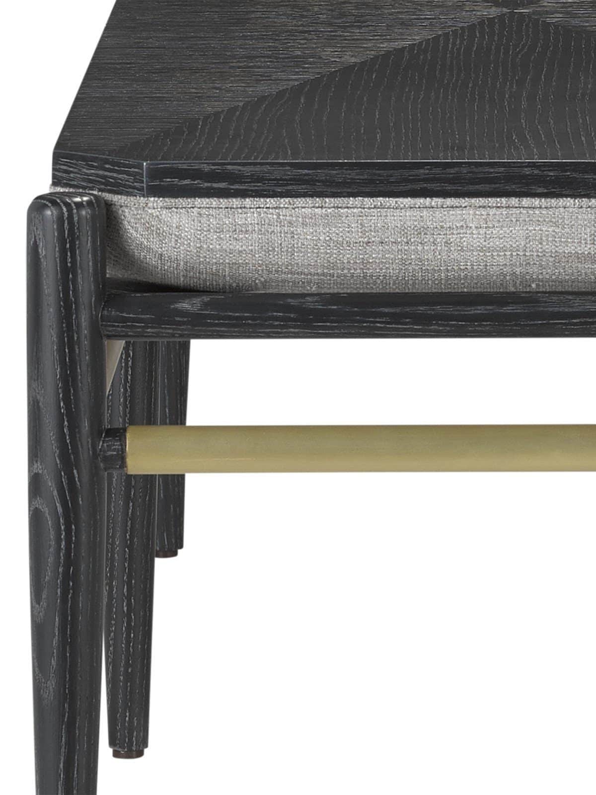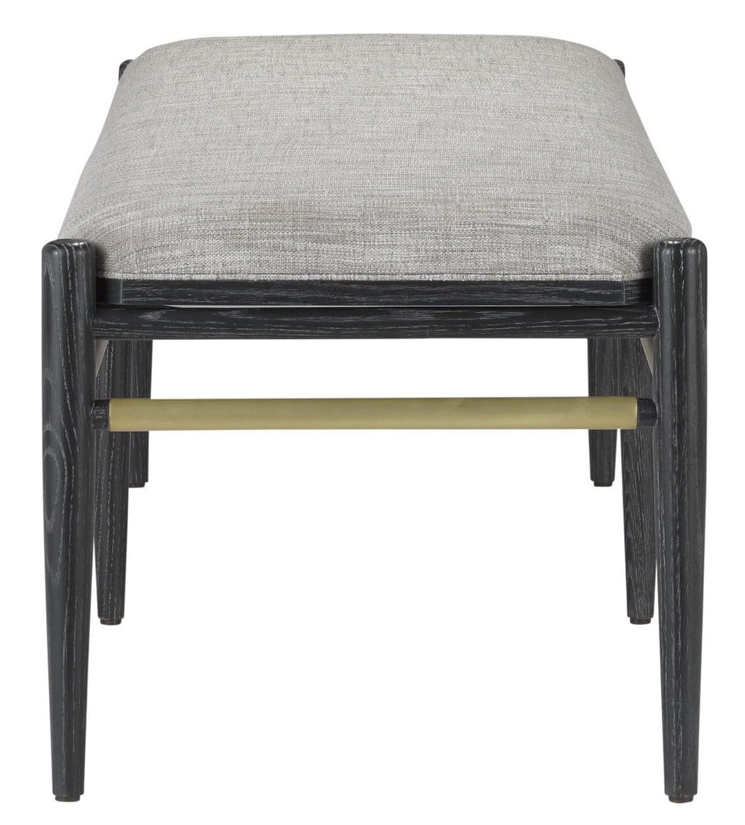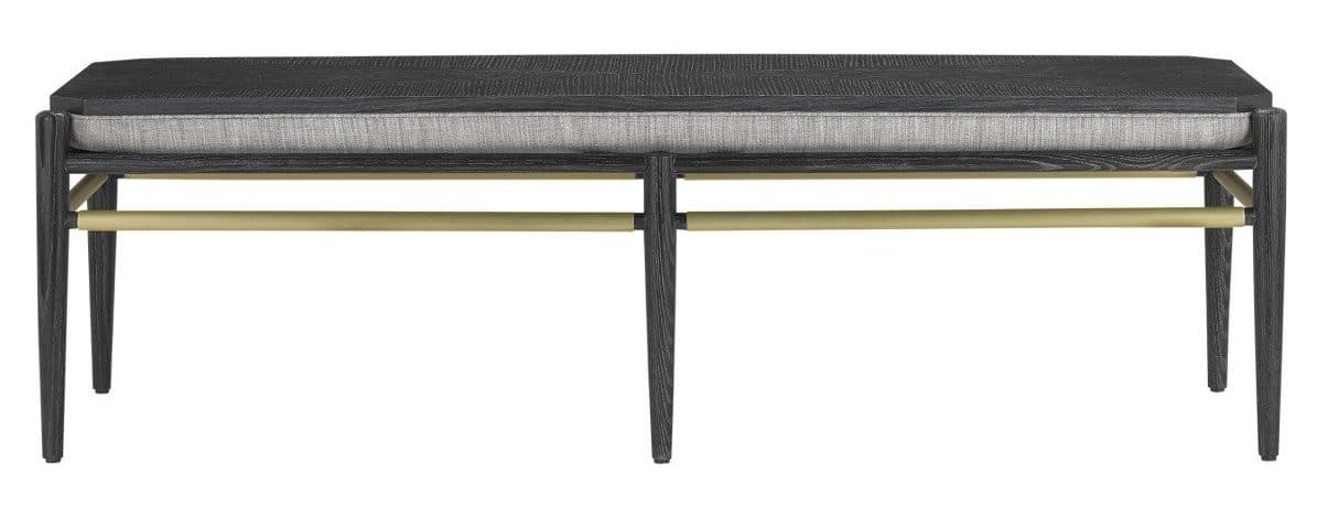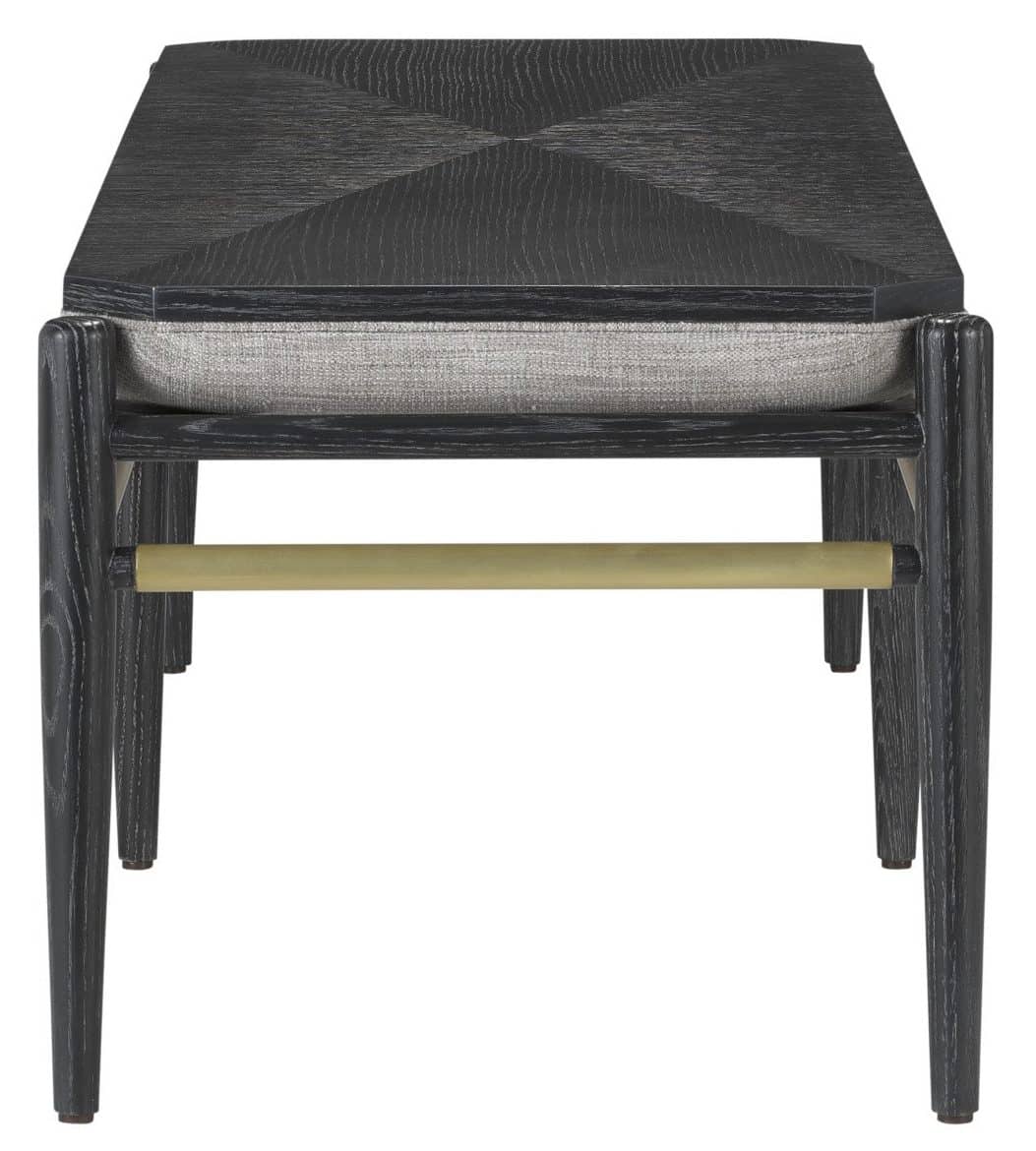 Product Description: Currey and Company 7000-0312 Visby Black Bench Arita Smoke - The Visby Black Bench is made of solid oak in a cerused black finish with a linear brass accent in a brushed brass finish. The mid-century lines are enhanced by the rough ceruse treatment on the wood. The seat cushion of the black bench is shown here upholstered in a Arita Smoke fabric. It is reversible so that the Visby can be used either as a seat or a table.