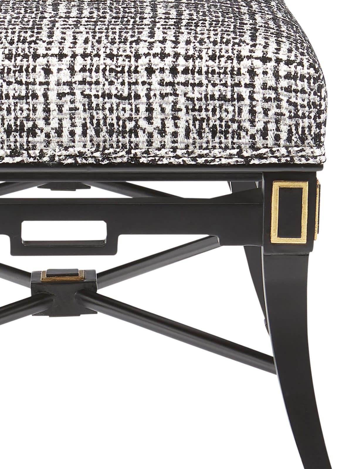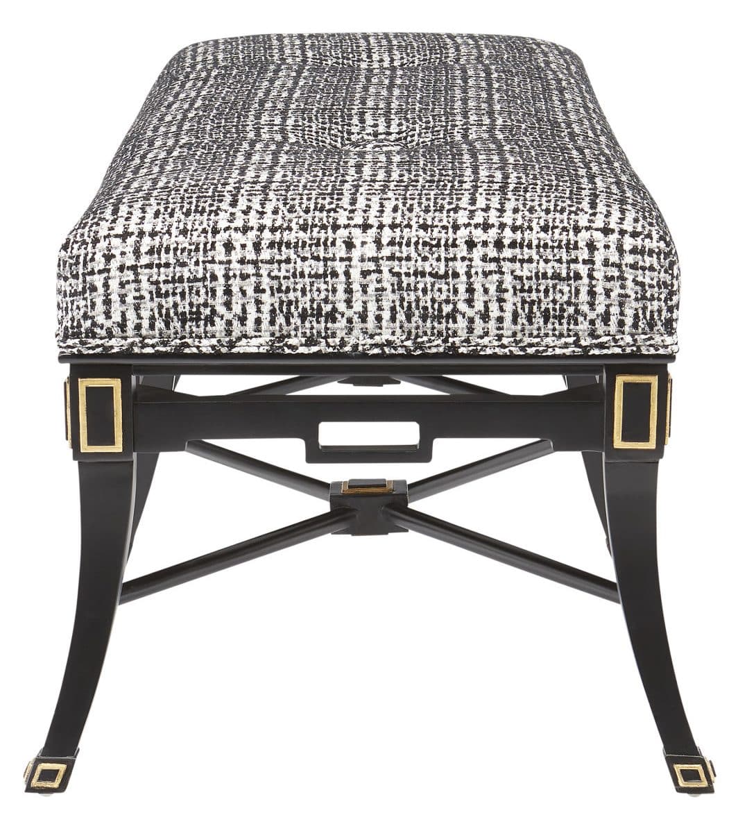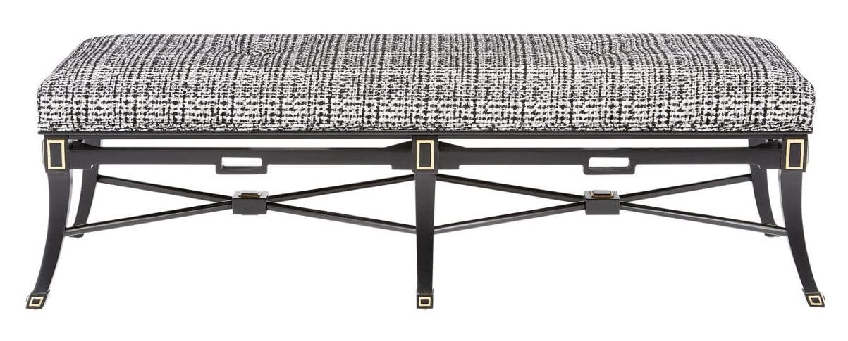 Product Description: Currey and Company 7000-0492 Scarlett Black Bench Marrazzo Tuxedo - The Scarlett Black Bench has lines and detailing that were inspired by an antique foot stool. The classic lines have been updated to bring it a chic modern feel. Among the sophisticated design features are geometric adornments in gold leaf, cut-outs in the frame that echo these shapes, and stretchers with square ornamentations where they connect in the center.