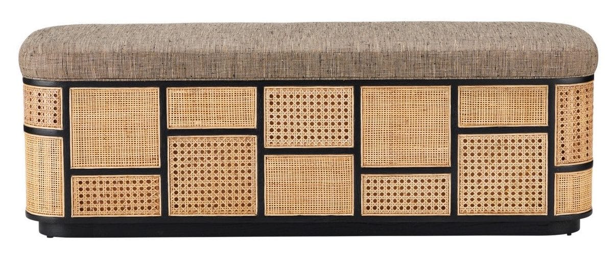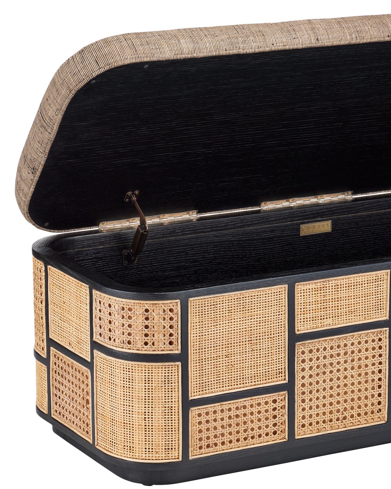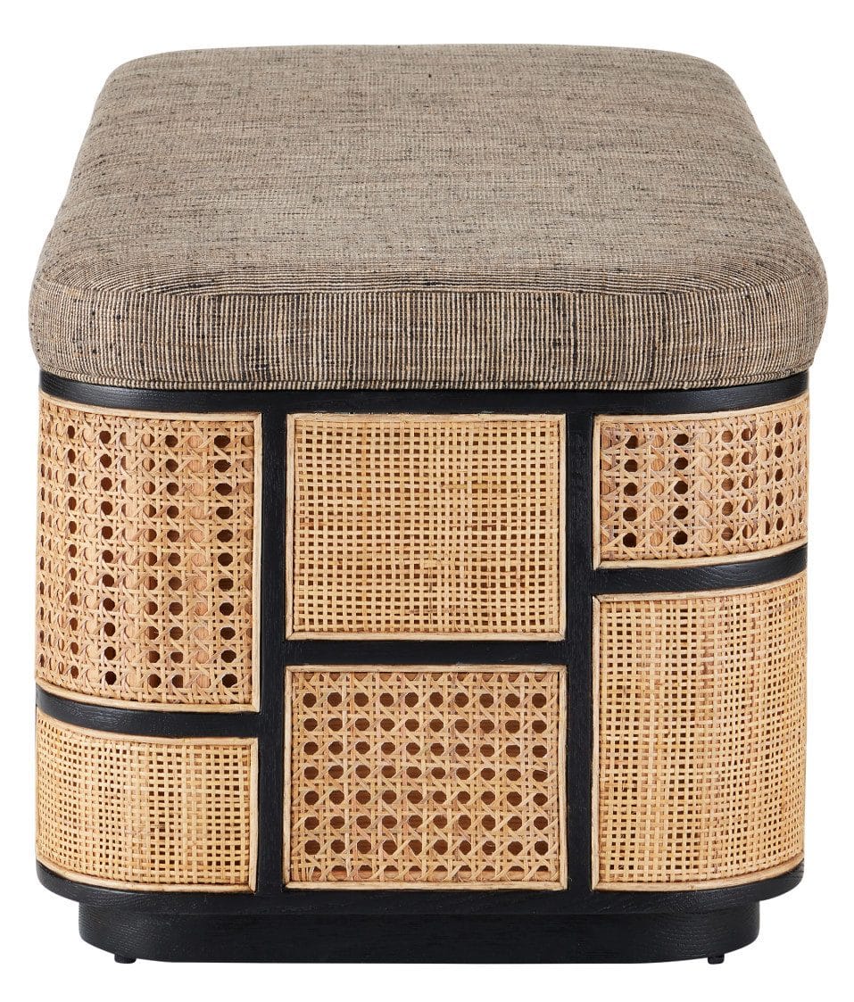 Product Description: Currey and Company 7000-0692 Anisa Black Storage Bench Trailside Natural Instinct Safari - The Anisa Black Storage Bench, covered in Trailside Natural Instinct Safari fabric, combines several weaving techniques. The natural oak form in caviar black finish is fitted with rattan cane panels, while the larger rattan sections are done in a radio weave and the smaller ones in an open weave. Not only does this mix it up texturally, it adds interest to this piece. The parchment-colored seat and the plinth base on which it sits places this firmly in a natural and black style story. The generous size of the storage area will make it a favorite go-to spot for storing linens, toys or other accessories.