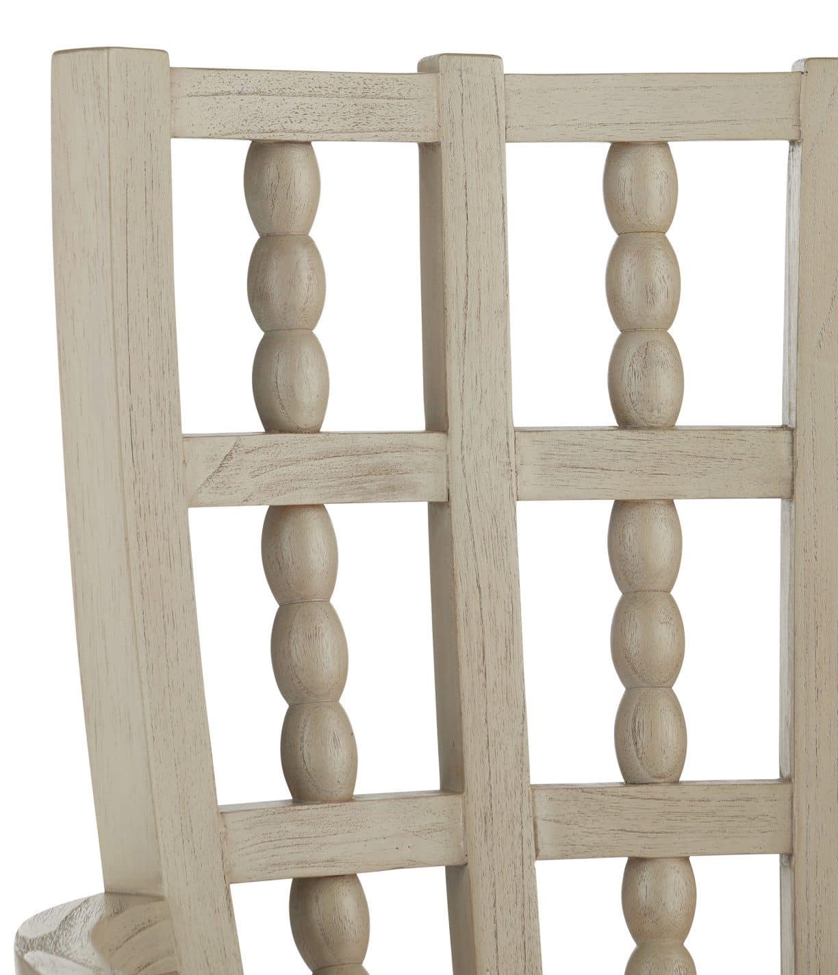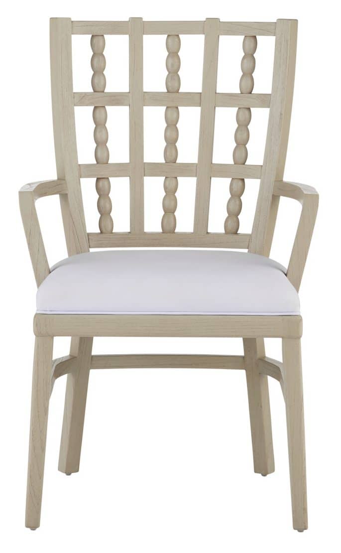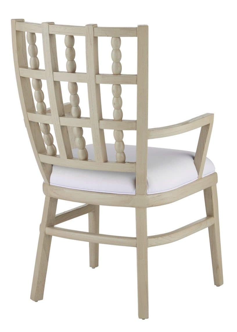 Product Description: Currey and Company 7000-0711 Norene Gray Armchair Muslin - The Norene Gray Armchair is made of fog gray-finished Mindi wood. The wood grain shows through the finish to lighten the material and bring a textural feel to the piece. Special attributes about the design of this gray dining chair are the bobbin, or spool, ornamentations that are intermittently placed along its back.