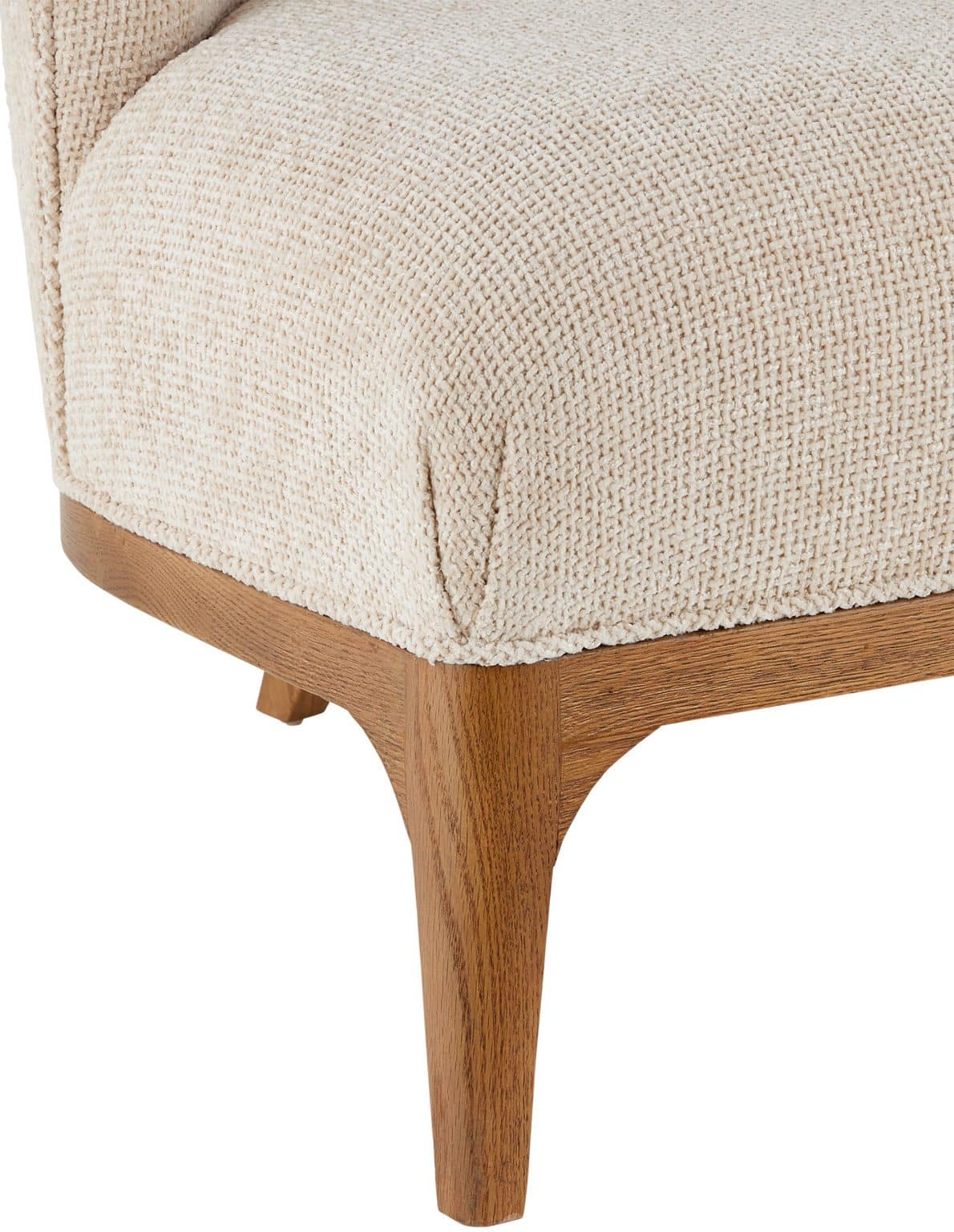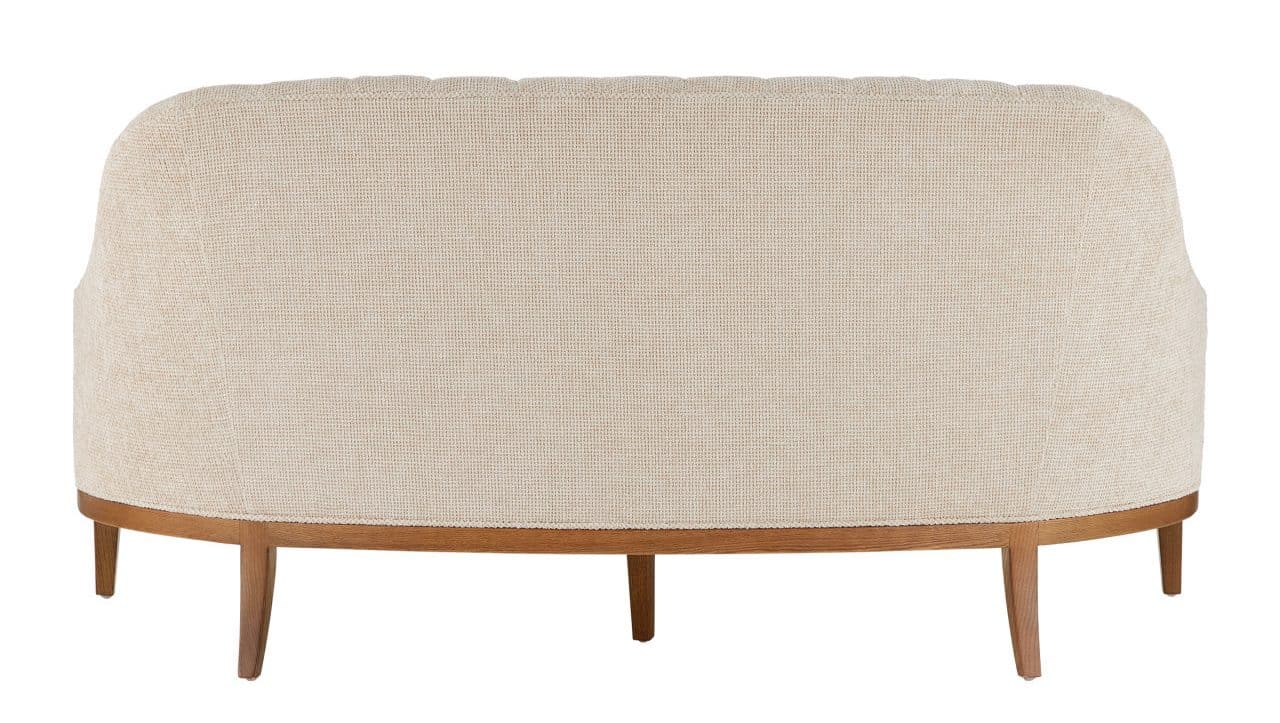 Product Description: Currey and Company 7000-0772 Inga Settee Crhom Nona Oatmeal - The Inga Settee, covered in Crhom Nona Oatmeal fabric, has an upholstered back and seat that sits nimbly atop a solid white-oak frame in a morel brown finish. The paleness of the fabric and the warmth of the wood are contrasting elements. The curved shape of the back and the tufted lines in the upholstered back are design details of note on this piece.