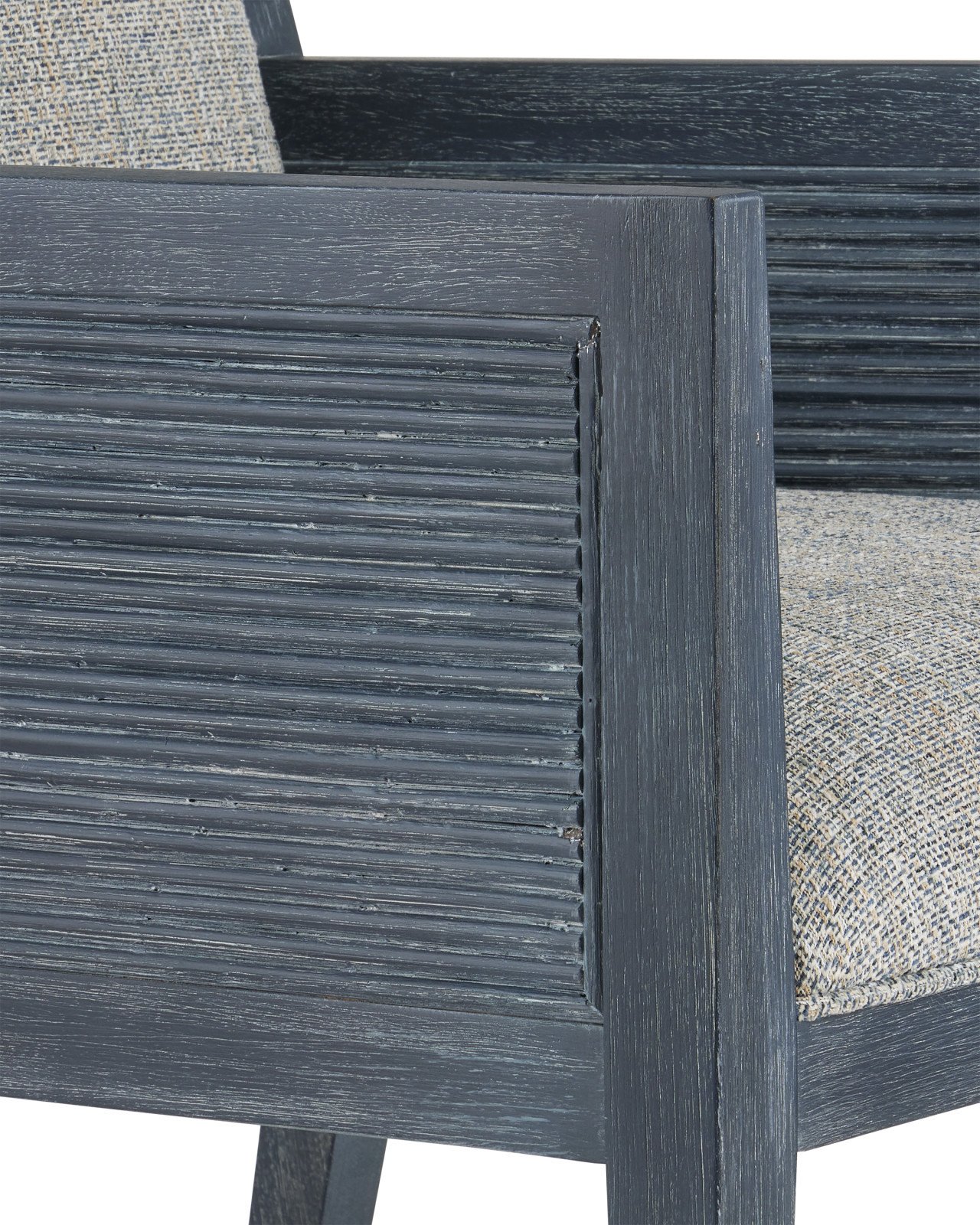 Product Description: Currey and Company 7000-0852 Santos Vintage Navy Armchair Barrett Dusk - The Santos Vintage Navy Armchair has a split rattan pattern on the back, and on the inside and outside of the arms, which is made by hand and applied to a solid mahogany frame. Once the natural material is in place, a vintage navy finish covers the back, frame, and legs. The blue armchair is upholstered in a Barrett Dusk material. The chair has brass ferrules to add sophistication to the overall design.