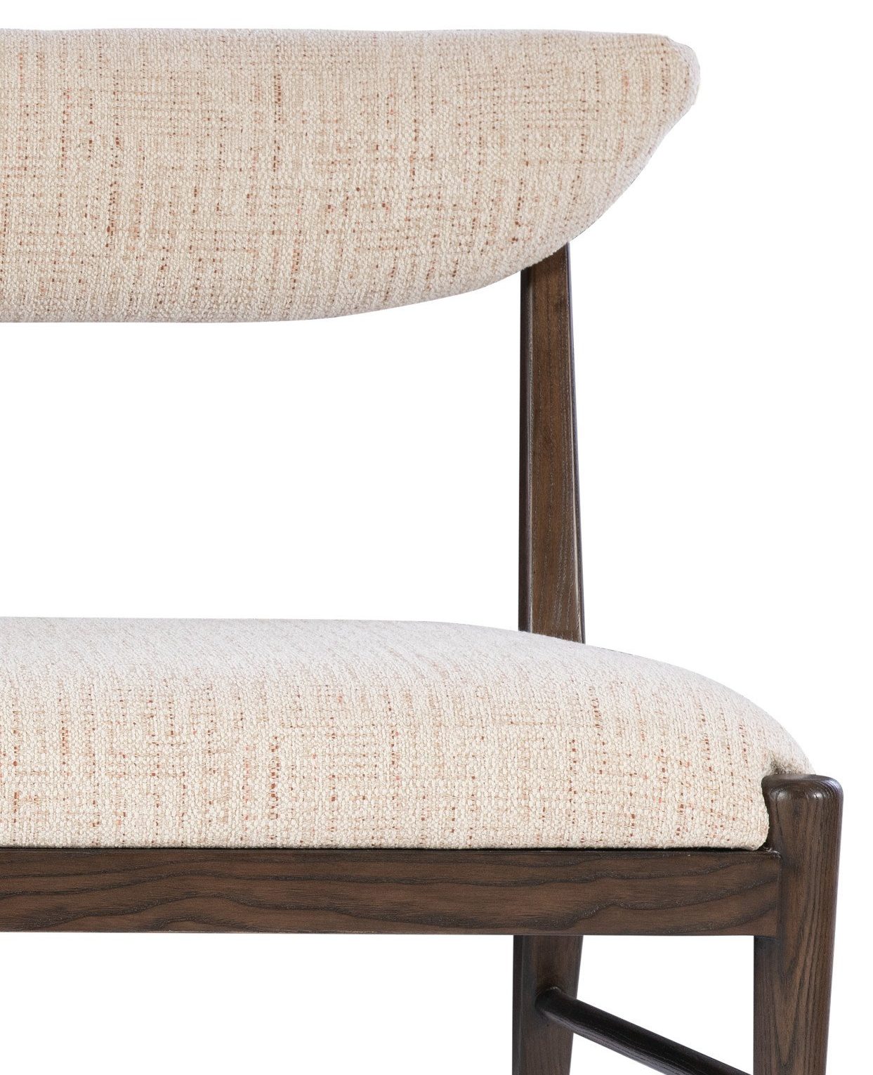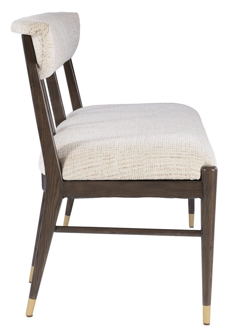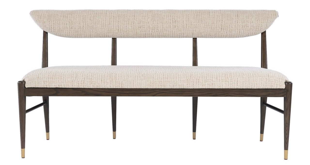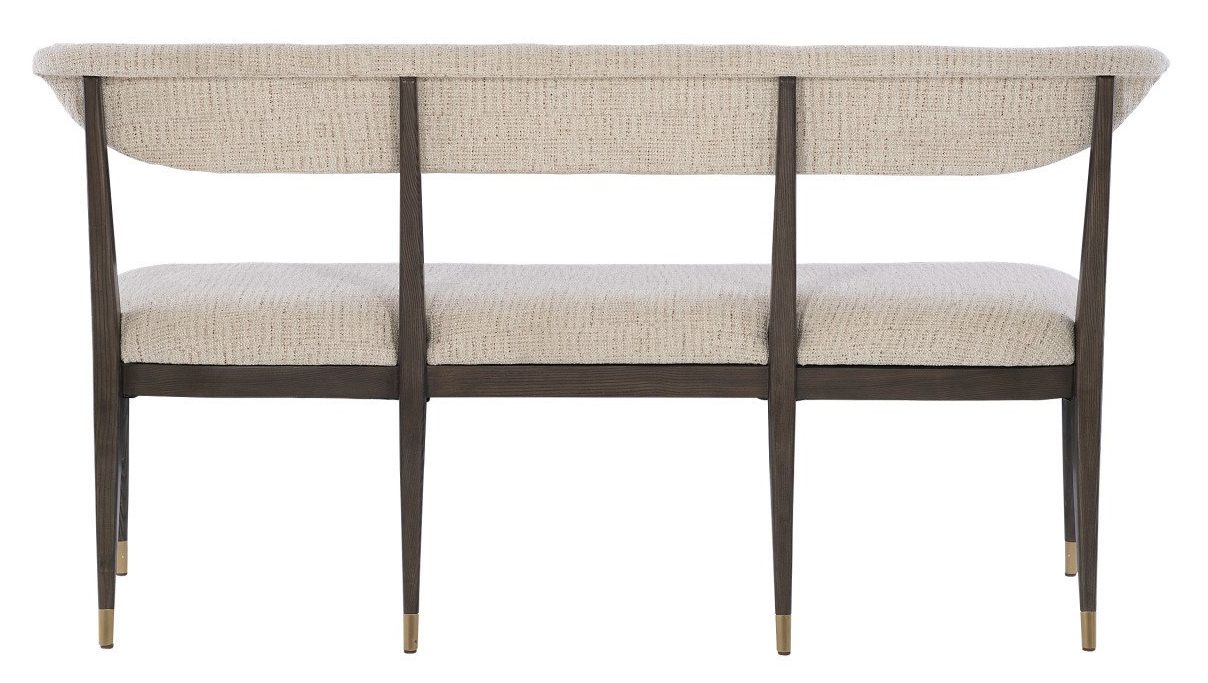 Product Description: Currey and Company 7000-0982 Arlan Coffee Bench Busio Desert - The Arlan Coffee Bench, which is made of ash wood in a coffee brown finish, has tailored contemporary lines. The back and seat are covered in a nubby performance fabric called Busio Desert, and the tapered legs that run along the sides and back are sophisticated design details on this piece of upholstery. The ferrules on the dark brown and white bench are in an antique brass finish.