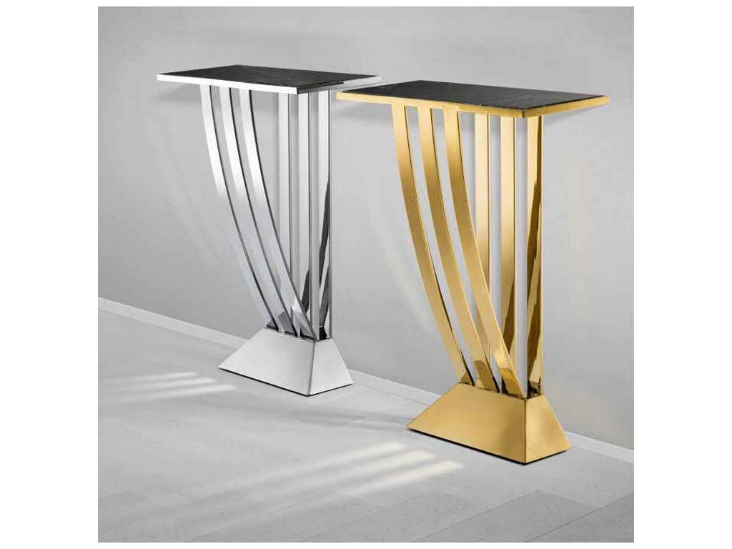 Product Description: Eichholtz 106336 Console Table Beau Deco - Create a monochromatic effect in your interior with the Beau Deco Console Table. It comprises a unique polished stainless steel frame with a large, sturdy base and protruding slats on either side. The rectangular tabletop has a black marble surface.