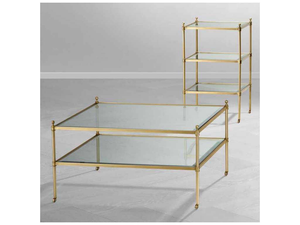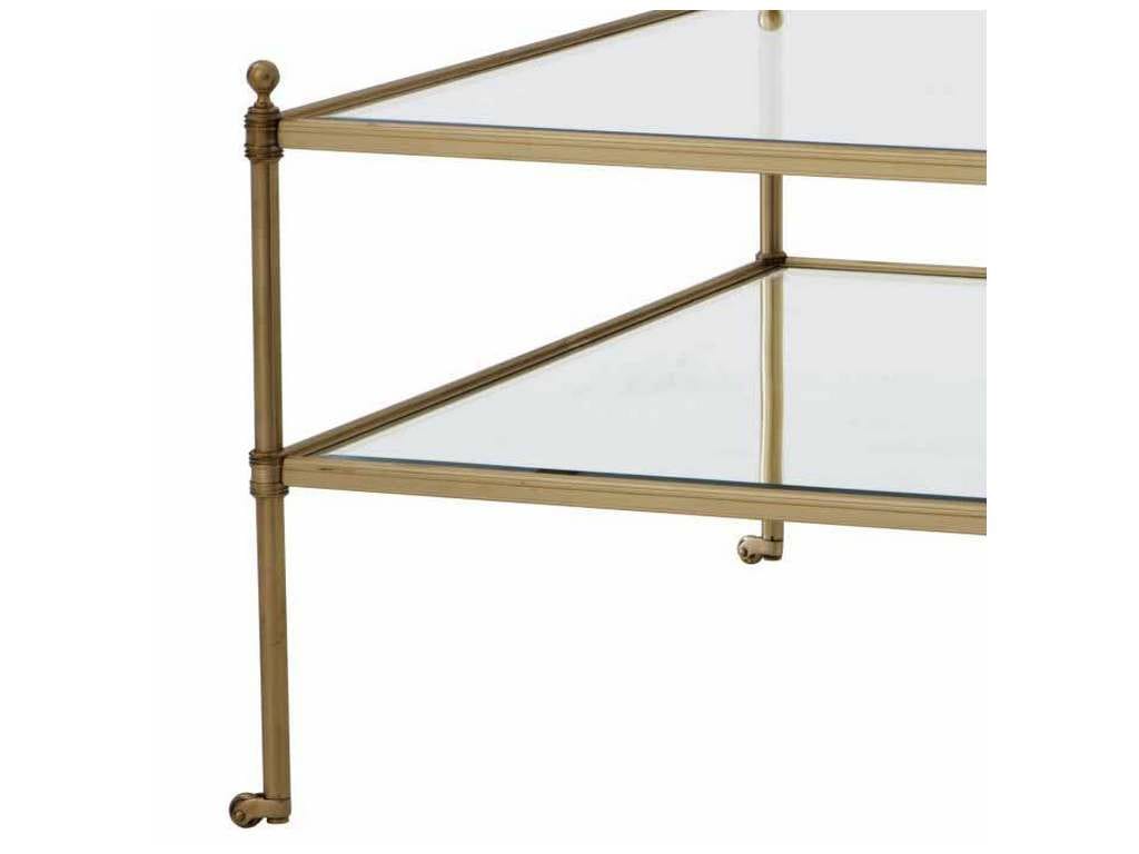 Product Description: Eichholtz 107217 Coffee Table Aubrey - Immerse yourself in the romantic beauty of the rectangular Aubrey Coffee Table. Crafted from aged brass, it features a tabletop and lower shelf of bevelled clear glass. Round finials on the corners and small castors add to the classic appeal.