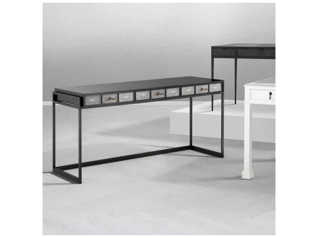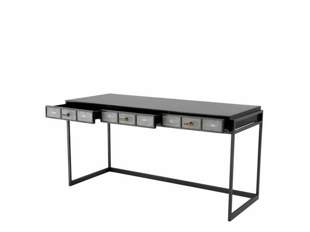 Product Description: Eichholtz 109523 Desk Paco - Add class and convenience to your home office, bedroom or hallway with the contemporary Paco Desk. The slim black frame contains three storage drawers with grey shagreen look and antique brass handles.