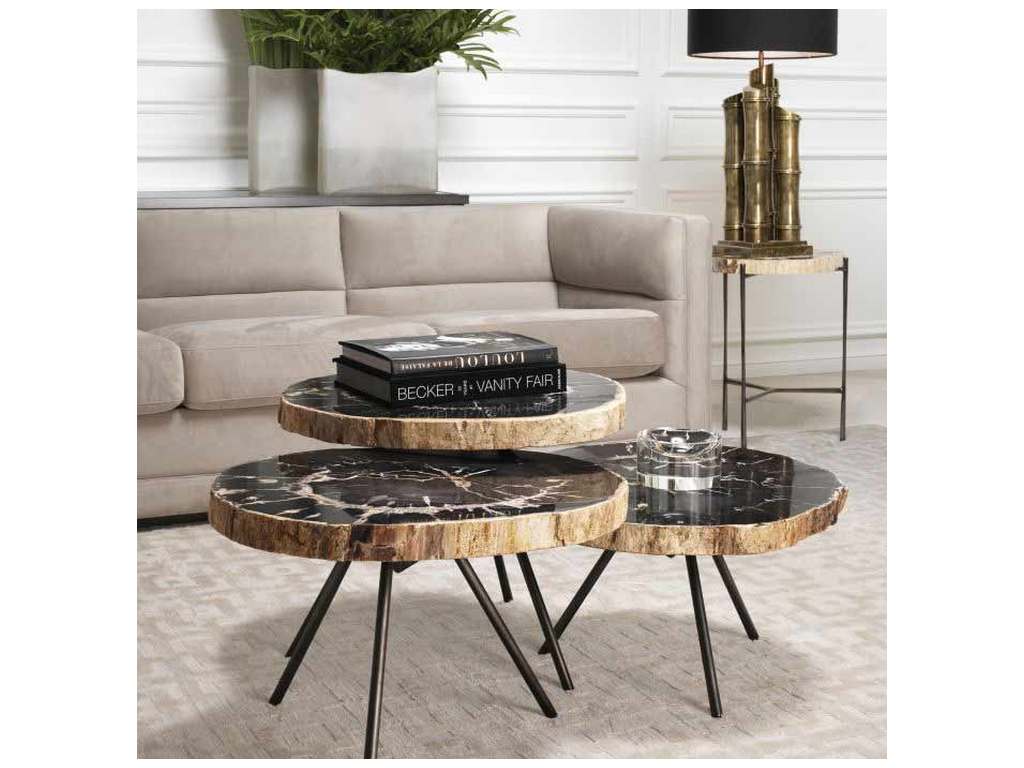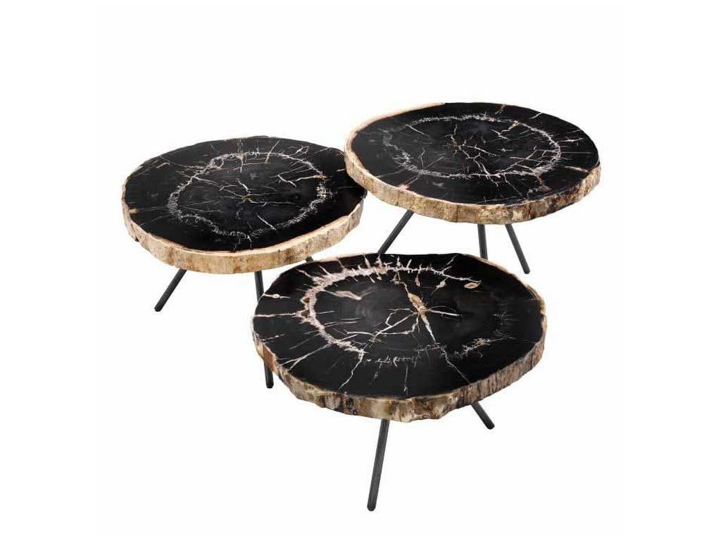 Product Description: Eichholtz 111465 Coffee Table De Soto Set of 3 - Grains, knots and holes grant a unique appearance to the Coffee Table De Soto set of 3 with petrified wood table tops. Characterised by natural black, brown, grey and white tones, these distinctive coffee tables are suitable for a variety of interior styles and colour schemes. The tables vary in height and feature bronze finish legs. Petrified wood literally means: wood turned into stone. Trees that have been buried under sediment for many years can transform into stone. While retaining the original structure of the stem tissue, all the organic materials are replaced with minerals.