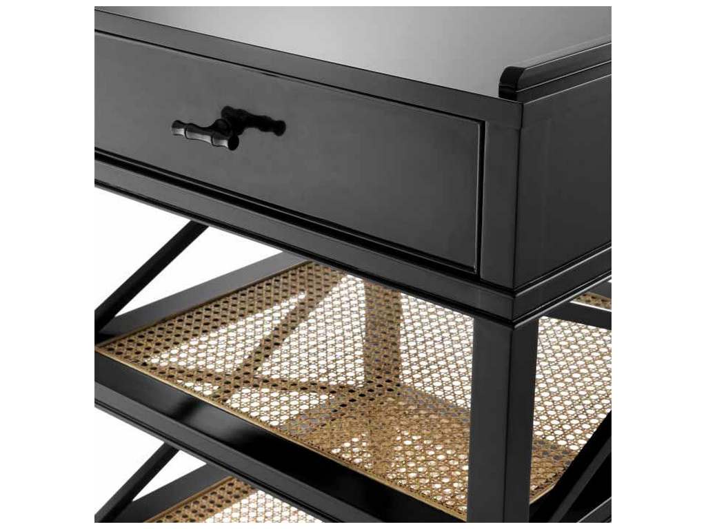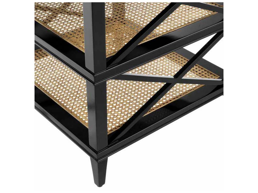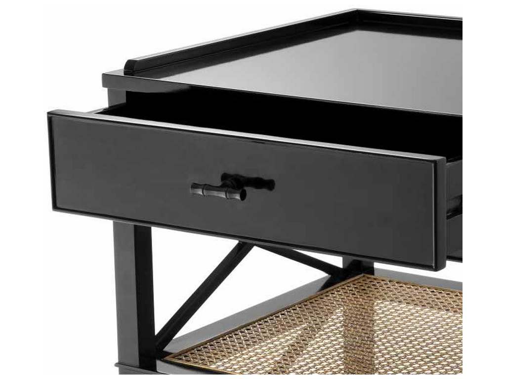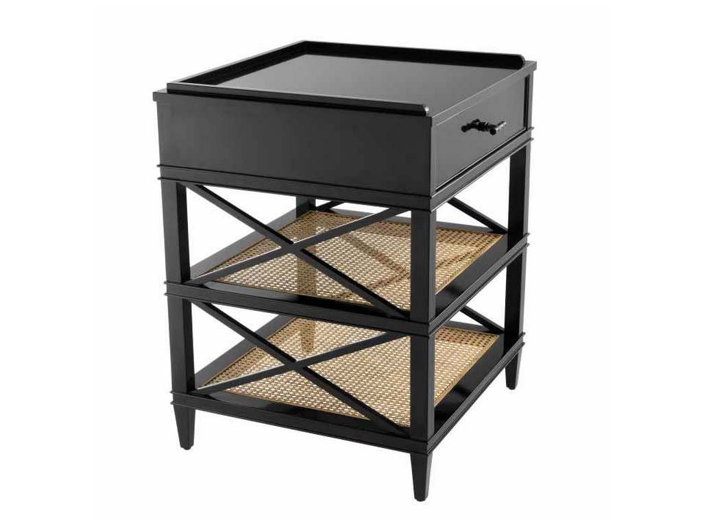 Product Description: Eichholtz 111692 Side Table Bahamas - Featuring a drawer and two lower shelves, the enchanting Bahamas Side Table makes a great nightstand. It is comprised of mahogany wood, natural mesh cane webbing and clear glass and has a black finish and cross bars for added design.