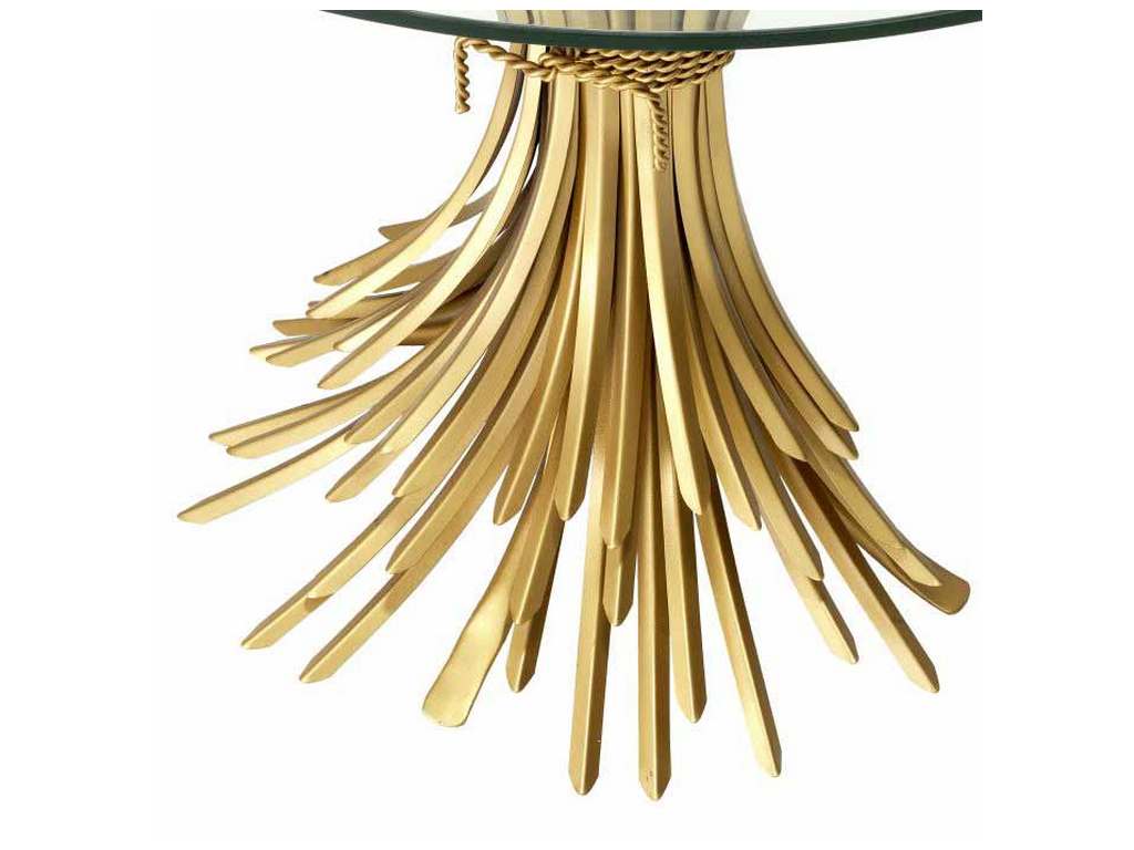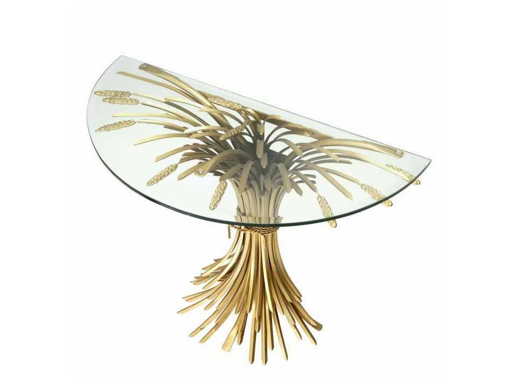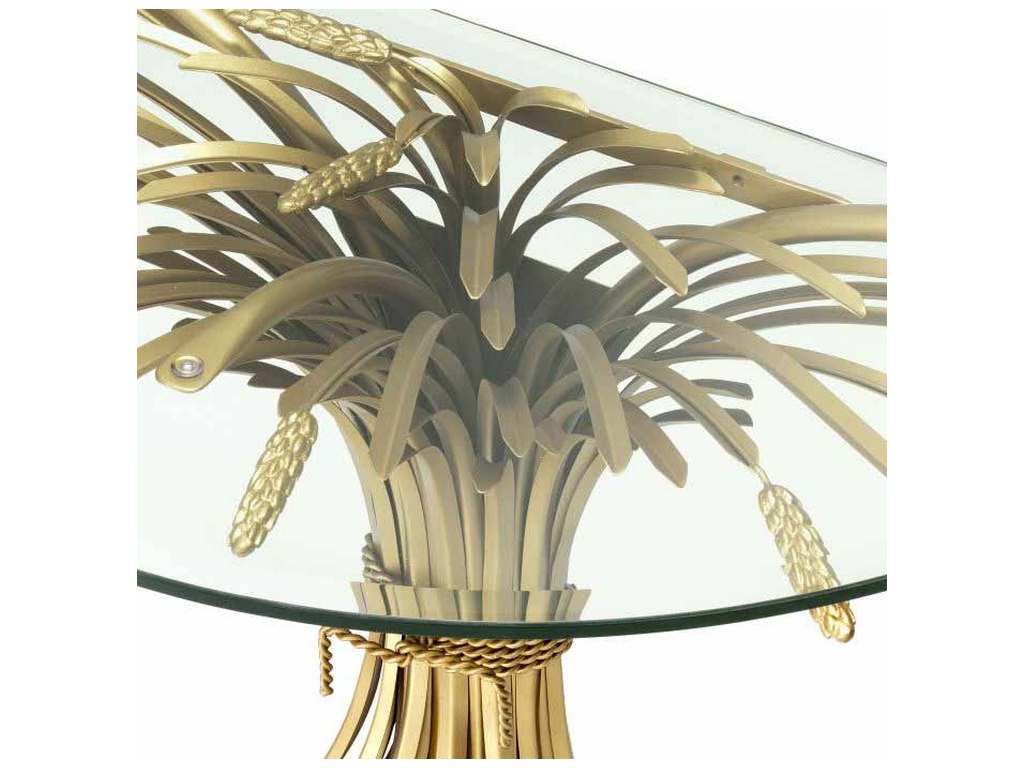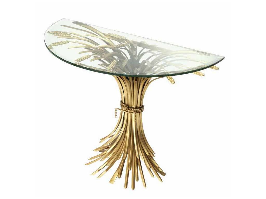 Product Description: Eichholtz 111804 Console Table Bonheur - Sculpted from iron in an antique gold finish, the dazzling Bonheur Console Table includes a sheaf-shaped base and a bevelled clear glass tabletop. Originally a symbol of prosperity and hospitality, the sheaf signifies one has worked hard and is now enjoying the good life.