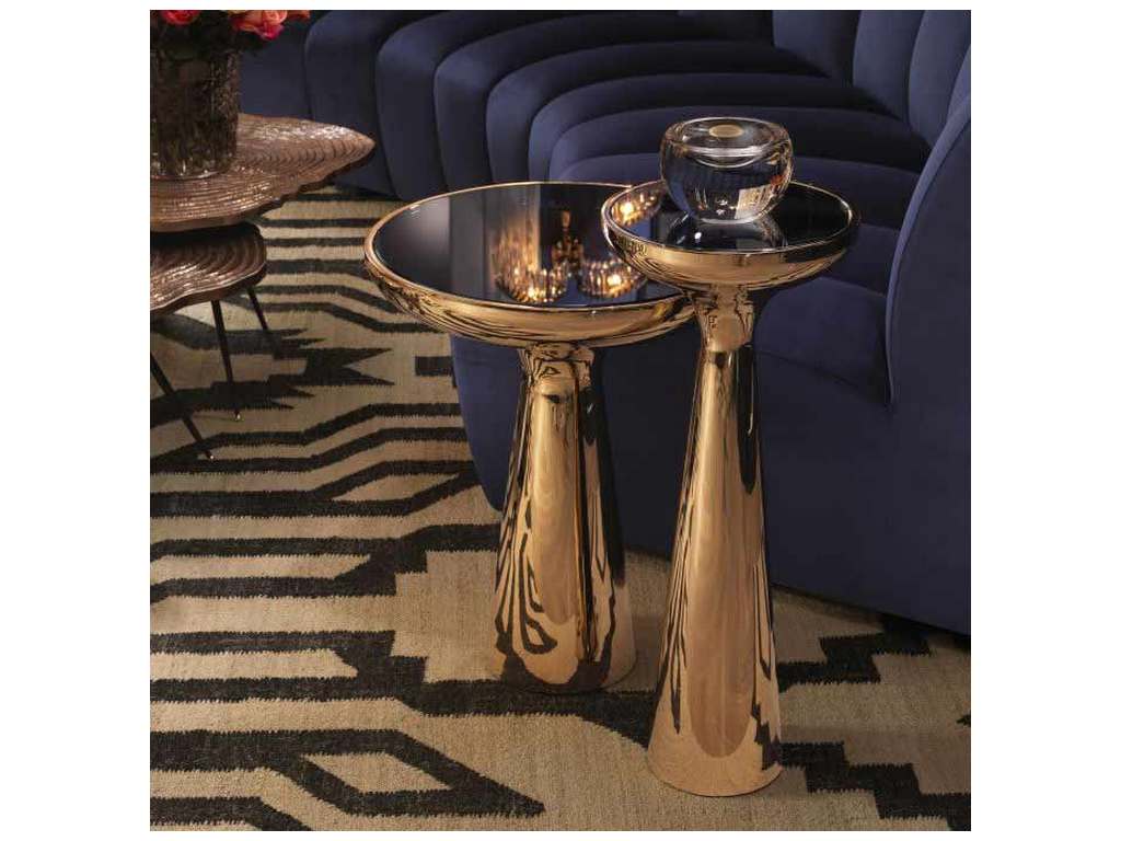 Product Description: Eichholtz 112504 Side Table Lindos High - The organic shaped high Lindos Side Table takes style cues from mid-20th-century Scandinavian design furniture. This stunning round end table features a stainless steel base in gold finish and a black glass tabletop.