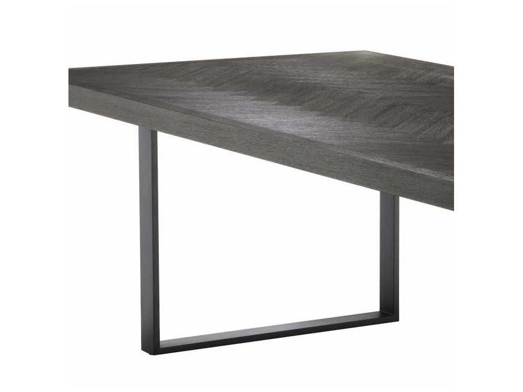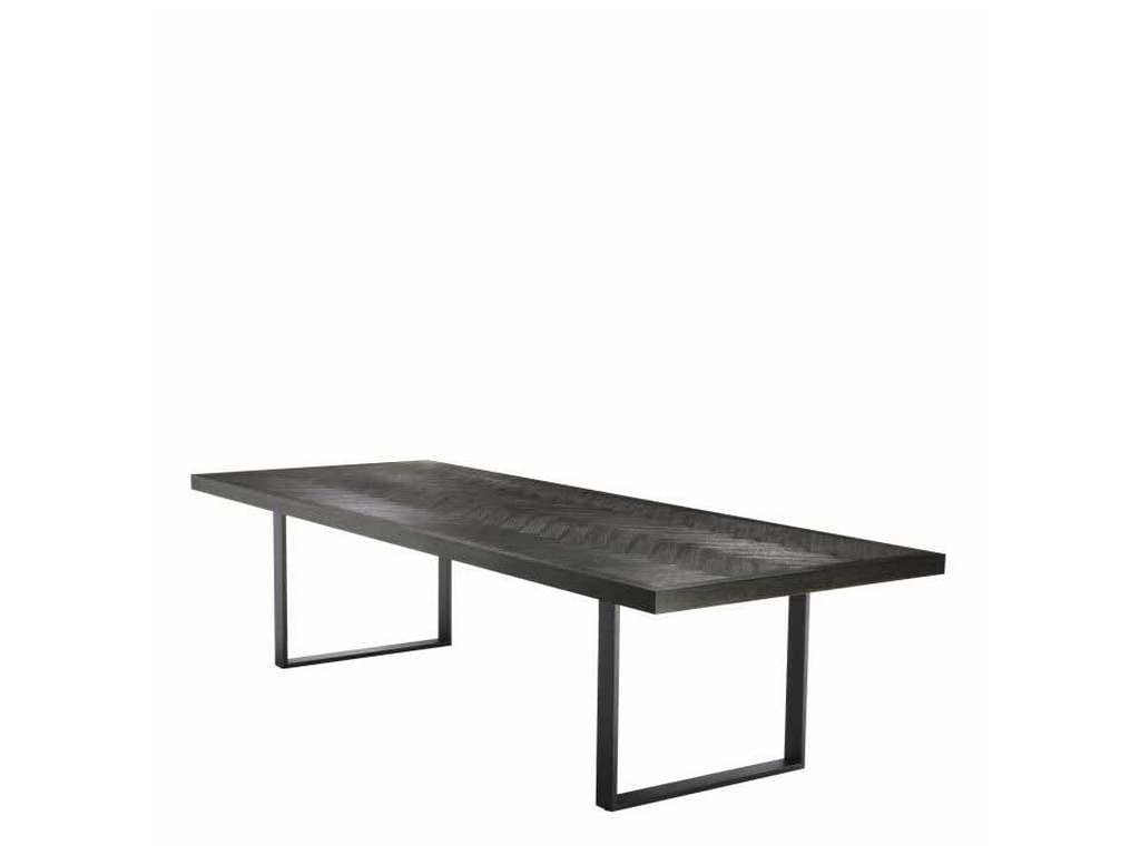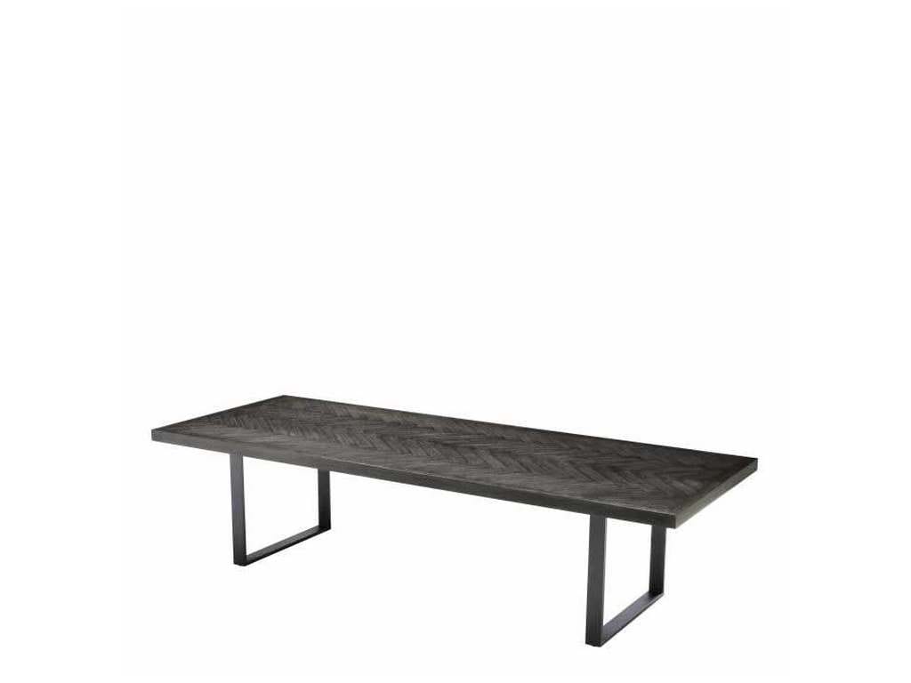 Product Description: Eichholtz 112634 Dining Table Melchior 300 cm - Reminiscent of Danish design furniture from the 1950s, the Melchior Dining Table grants your home interior a genuine retro look and feel. The charcoal oak veneer tabletop features a beautiful herringbone pattern. It rests on a metal base with bronze finish to ensure it effortly blends in a variety of decors.