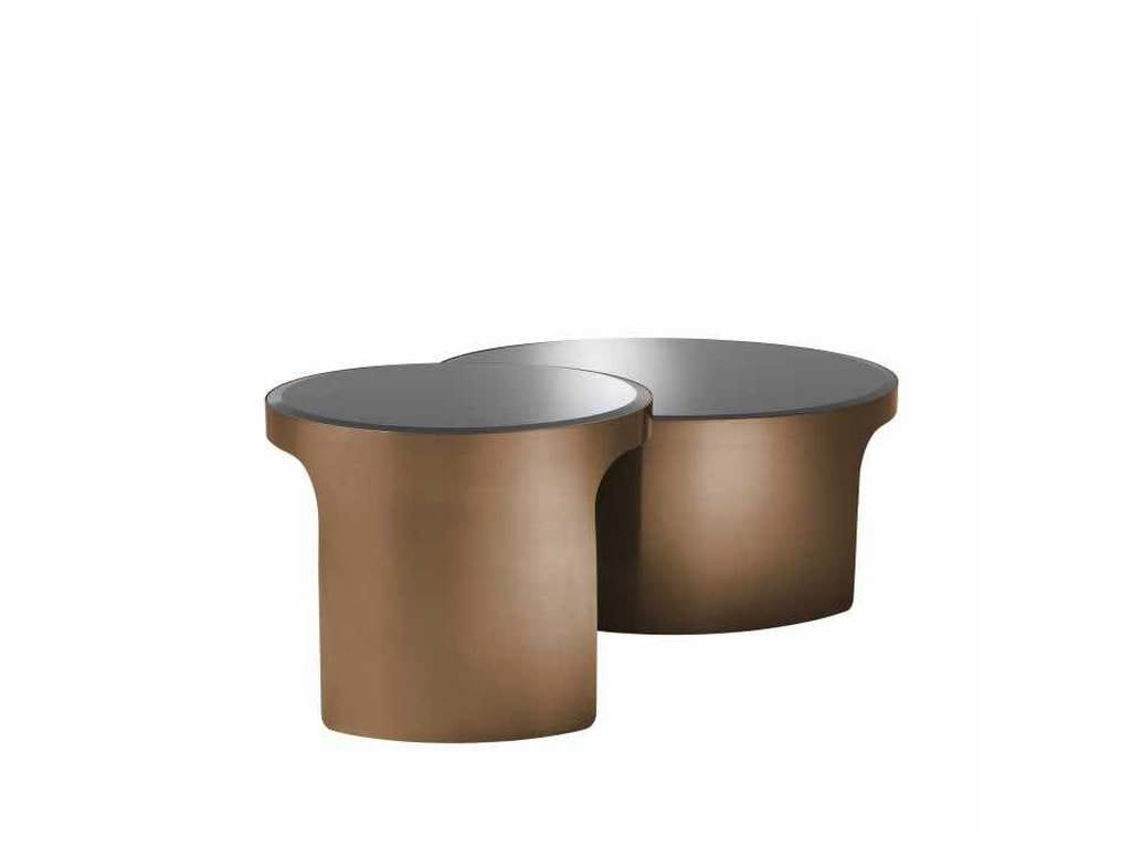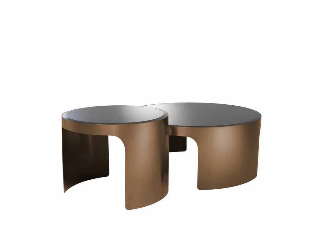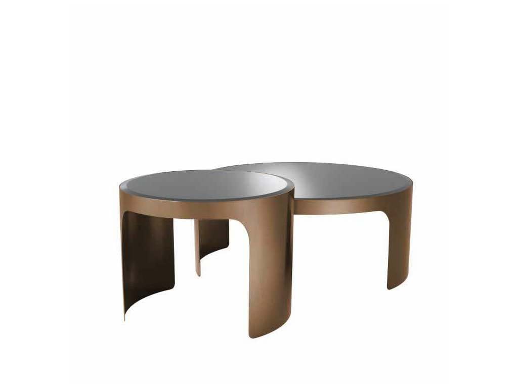 Product Description: Eichholtz 113299 Coffee Table Piemonts Set of 2 - Enhance your relaxation area with the set of 2 Piemonte Coffee Tables. The retro look and elegant curves of these two nesting tables are perfectly complementary. With a mirrored tabletop of bevelled black glass and a metal base in a brushed copper finish, they will make a chic addition to your living room decor.