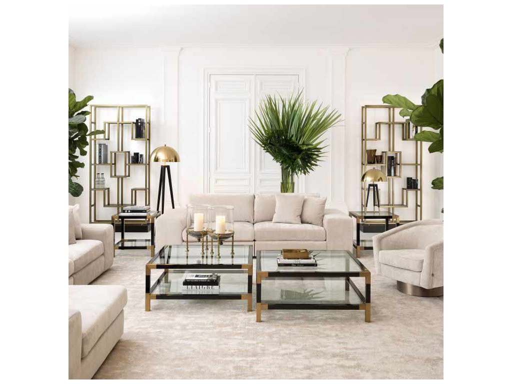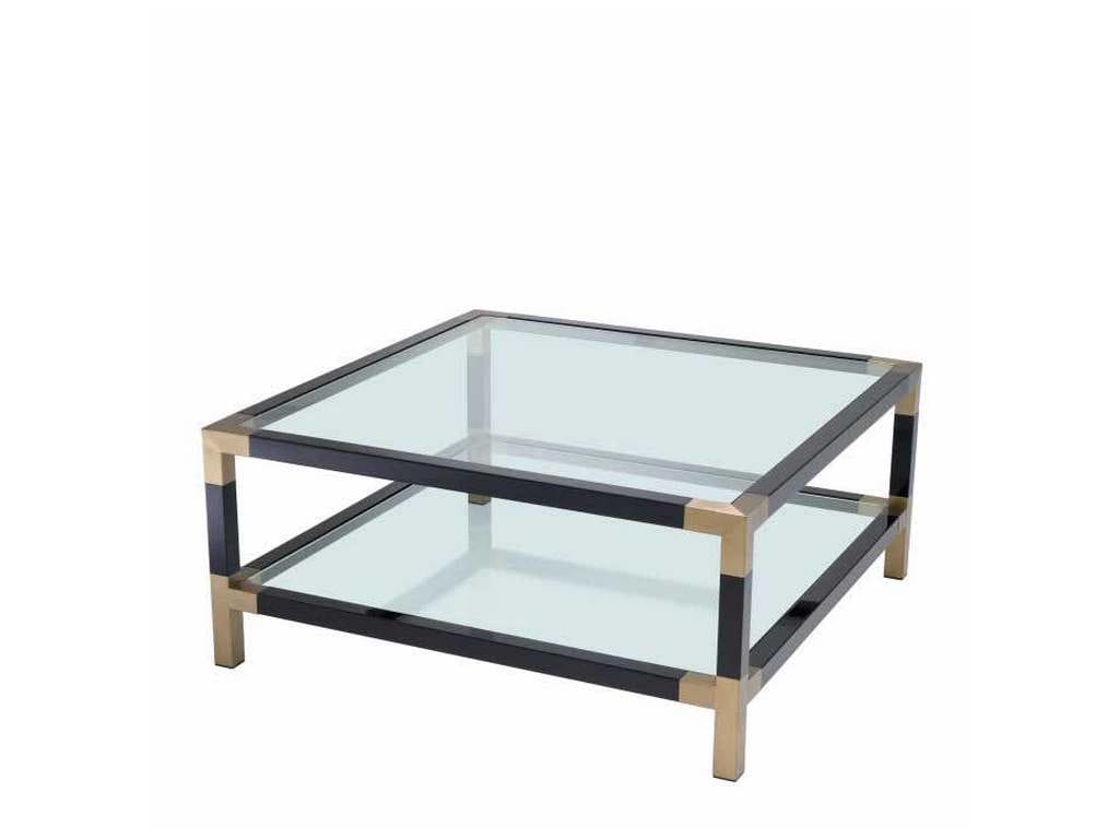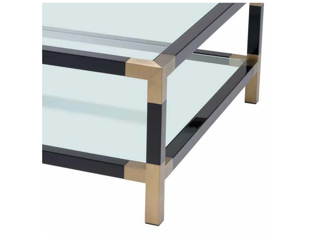 Product Description: Eichholtz 113317 Coffee Table Royalton - Enjoy the Bauhaus designer appeal of the Royalton Coffee Table. Its piano black frame features a tabletop and lower shelf of clear glass. Corners and legs with a brushed brass finish complete the modern aesthetic.