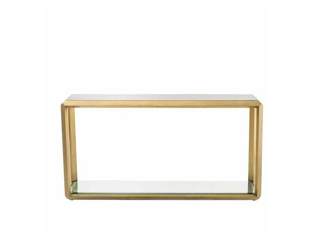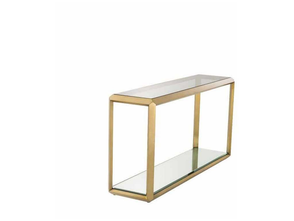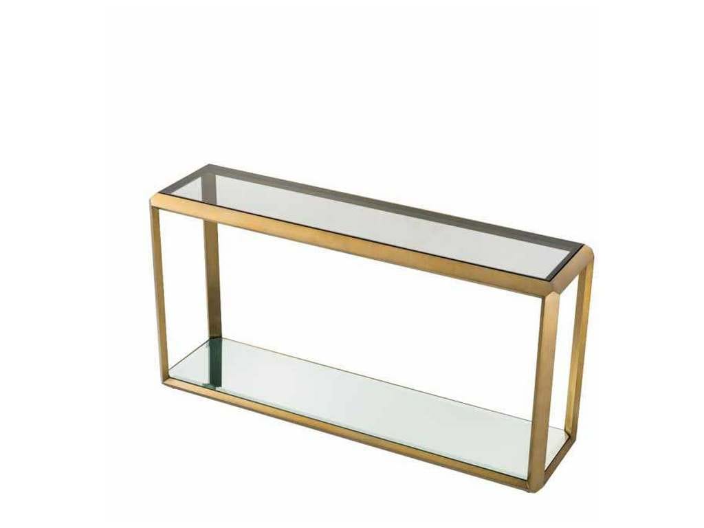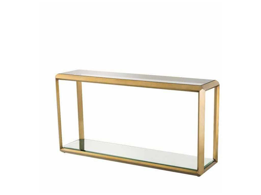 Product Description: Eichholtz 113349 Console Table Callum - Evoke the seductive style of the seventies with the decadent Callum Console Table. Its brushed brass frame with bevelled rims surrounds the tabletop of smoke glass and the bottom shelf of mirror glass. Whether you are going for a retro or contemporary look, this stylish console table will be a perfect choice.