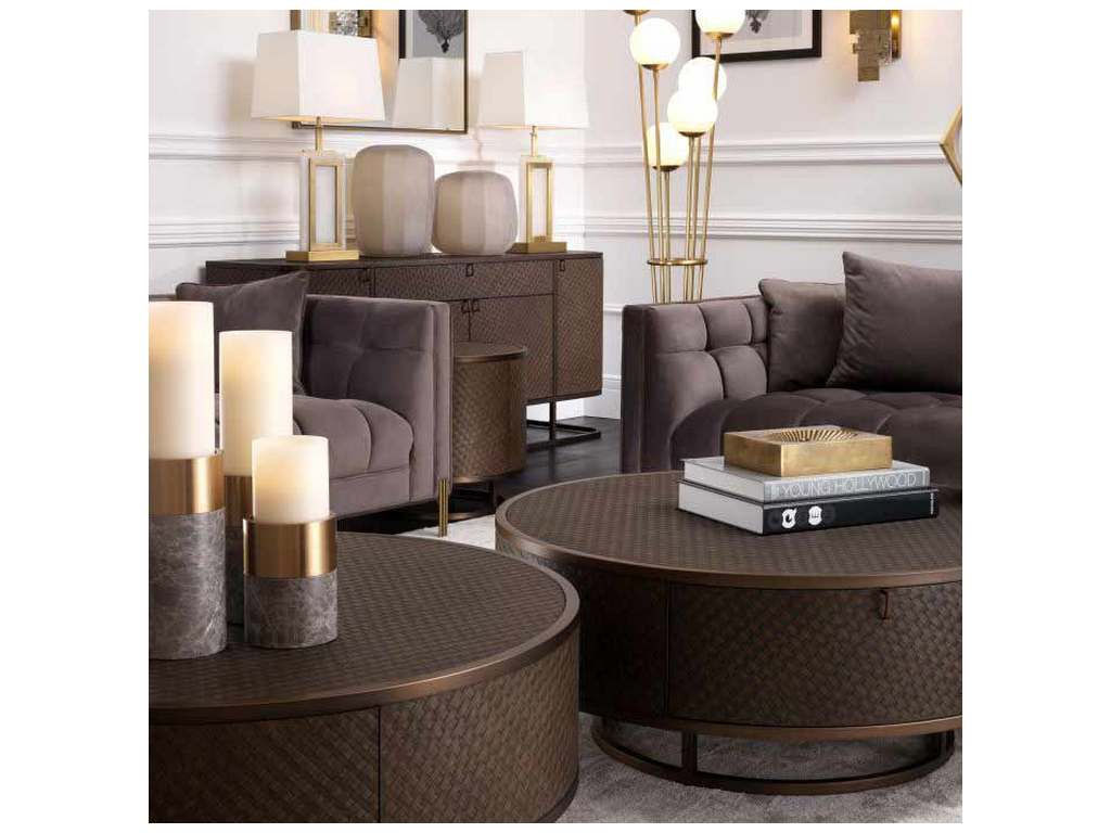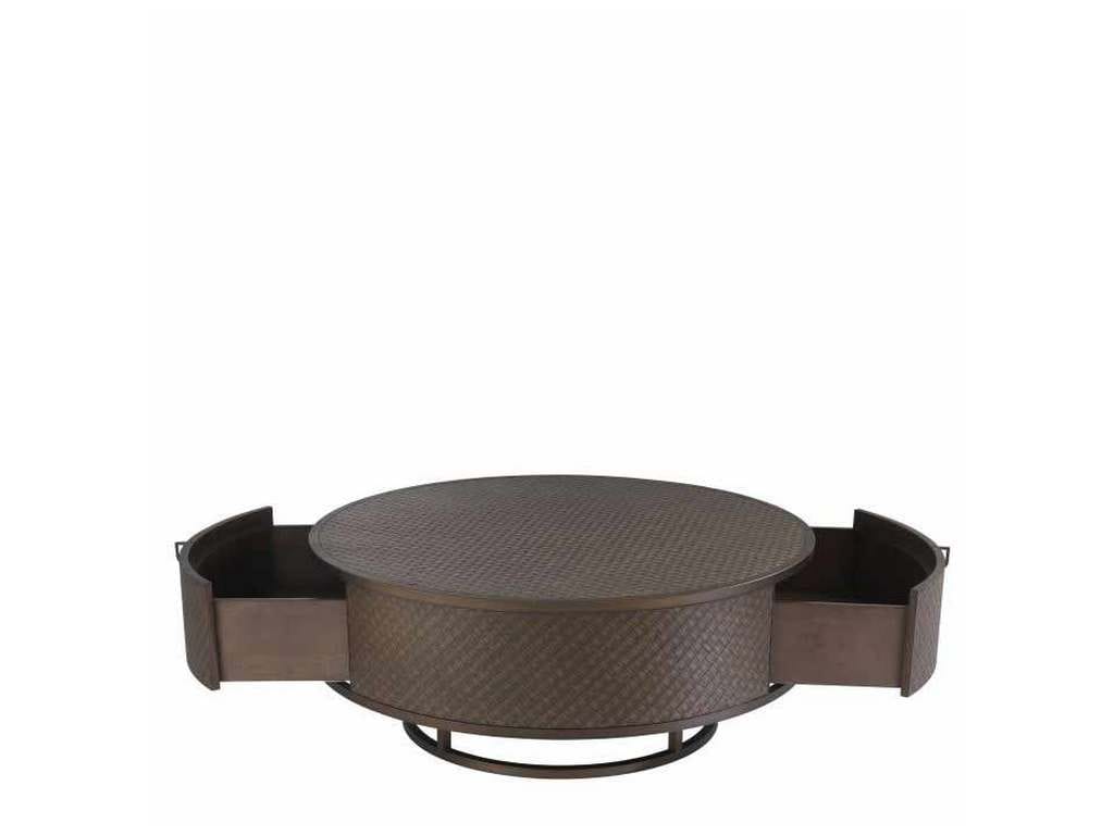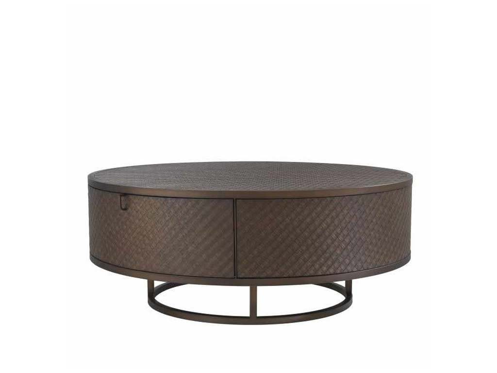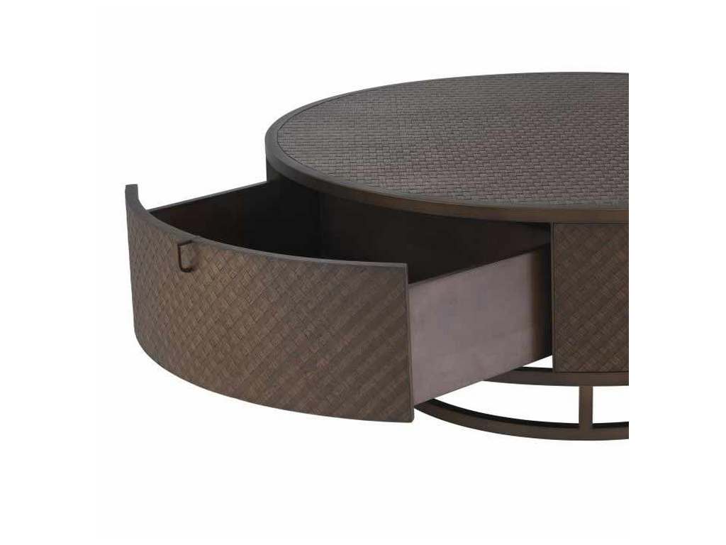 Product Description: Eichholtz 113394 Coffee Table Napa Valley - Pairing Bauhaus style with a Mid-Century Modern look, the beautiful drum-shaped Napa Valley Coffee Table features a stainless steel frame and is lined with woven oak veneer. Two large drawers with stainless steel handles offer ample storage space.