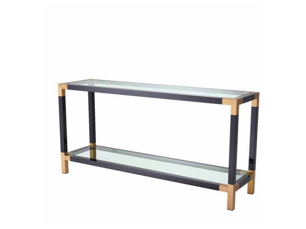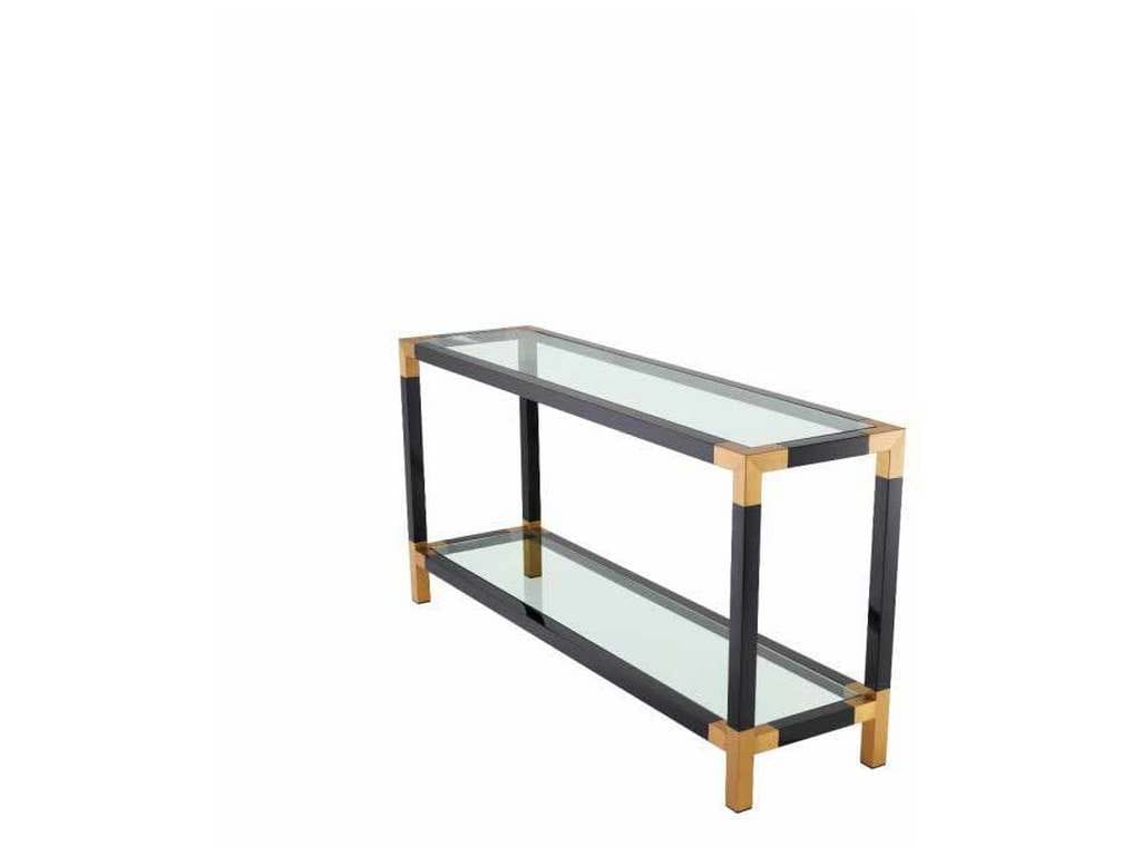 Product Description: Eichholtz 113844 Console Table Royalton - Enjoy the Bauhaus designer appeal of the Royalton Console Table. Its piano black frame features a tabletop and lower shelf of clear glass. Corners and legs with a brushed brass finish complete the modern aesthetic