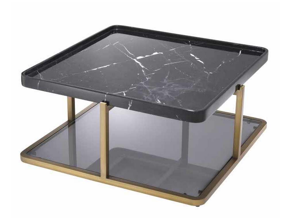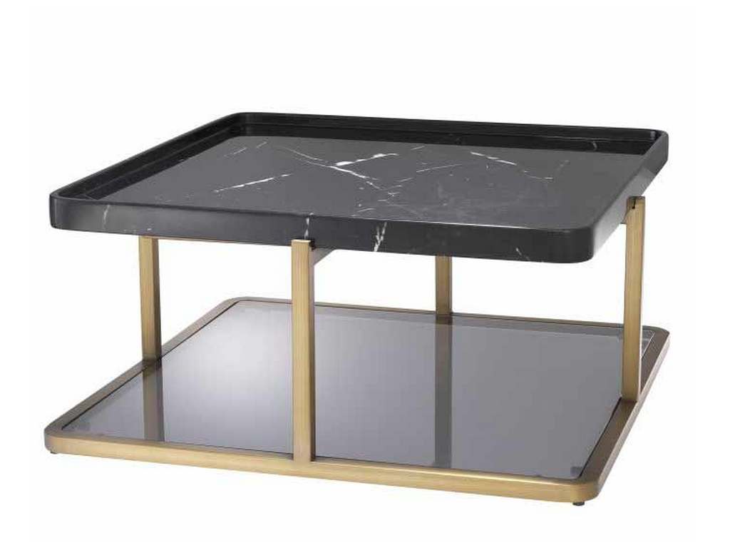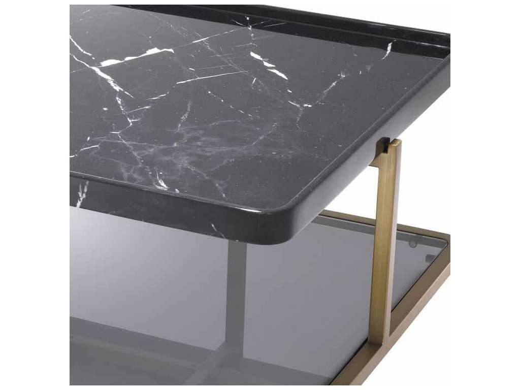 Product Description: Eichholtz 113945 Coffee Table Grant - Luxurious and posh, Coffee Table Grant offers a touch of stately elegance. Its design is something special. Crafted from black marble, the square tabletop has rounded corners and raised edges. Striking is that the brushed brass finish frame has legs in the middle of each side, instead of at the corners. Standing on a sturdy base of smoke glass with a brushed brass rim, this table is sure to be a focal point in your living room decor.