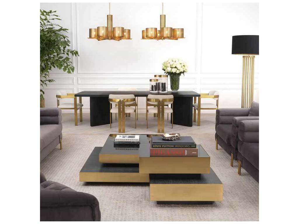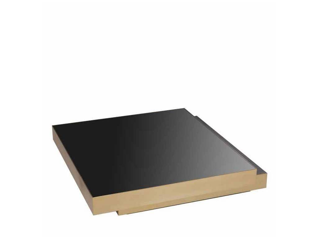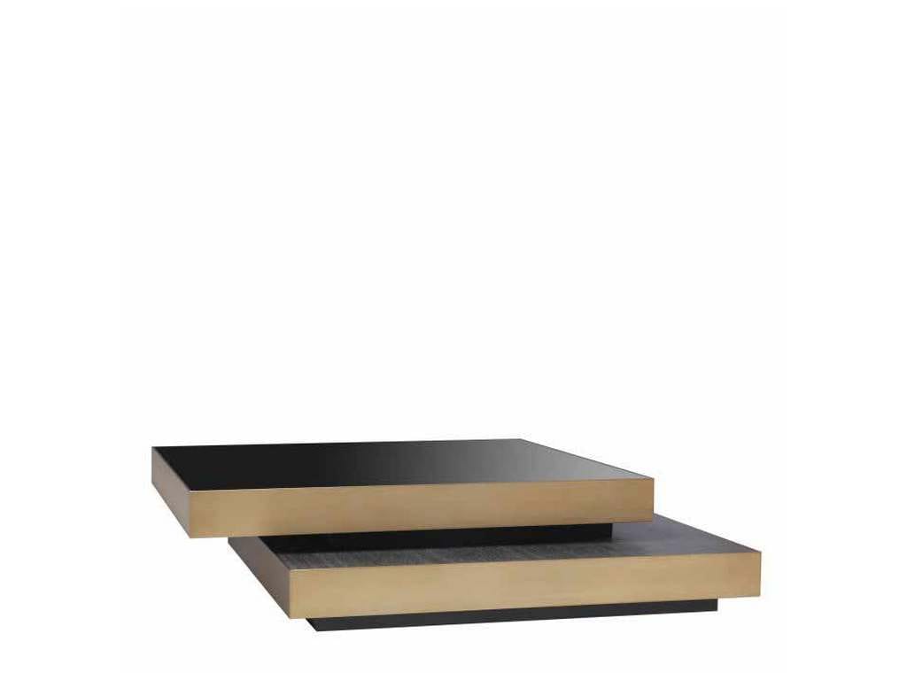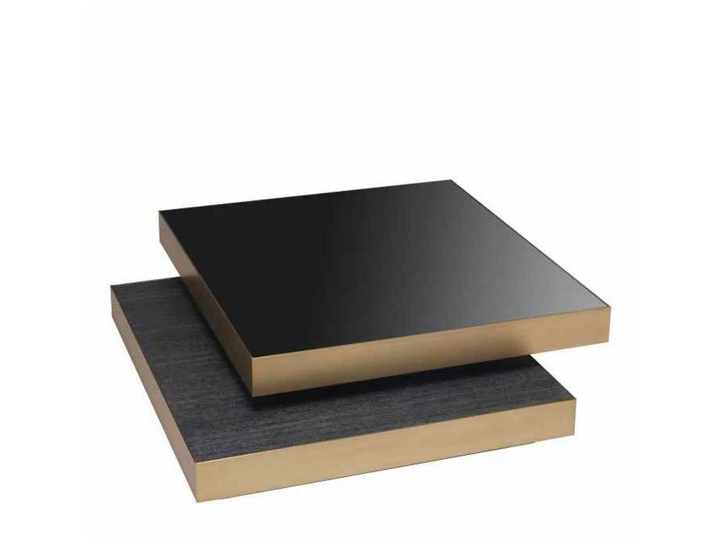Product Description: Eichholtz 114433 Coffee Table Shelton - Create an extravagant new look in your living room with Coffee Table Shelton. This quirky design features two overlapping squares with a brushed brass rim. The lower square has a top of charcoal grey oak veneer, the upper one has a top of black glass.