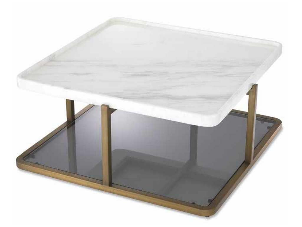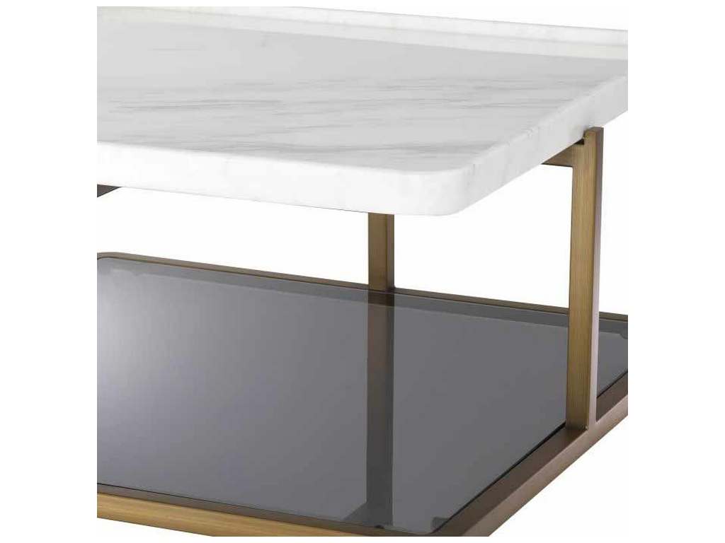 Product Description: Eichholtz 115141 Coffee Table Grant - Luxurious and posh, Coffee Table Grant offers a touch of stately elegance. Its design is something special. Crafted from white marble, the square tabletop has rounded corners and raised edges. Striking is that the brushed brass finish frame has legs in the middle of each side, instead of at the corners. Standing on a sturdy base of smoke glass with a brushed brass rim, this table is sure to be a focal point in your living room decor.