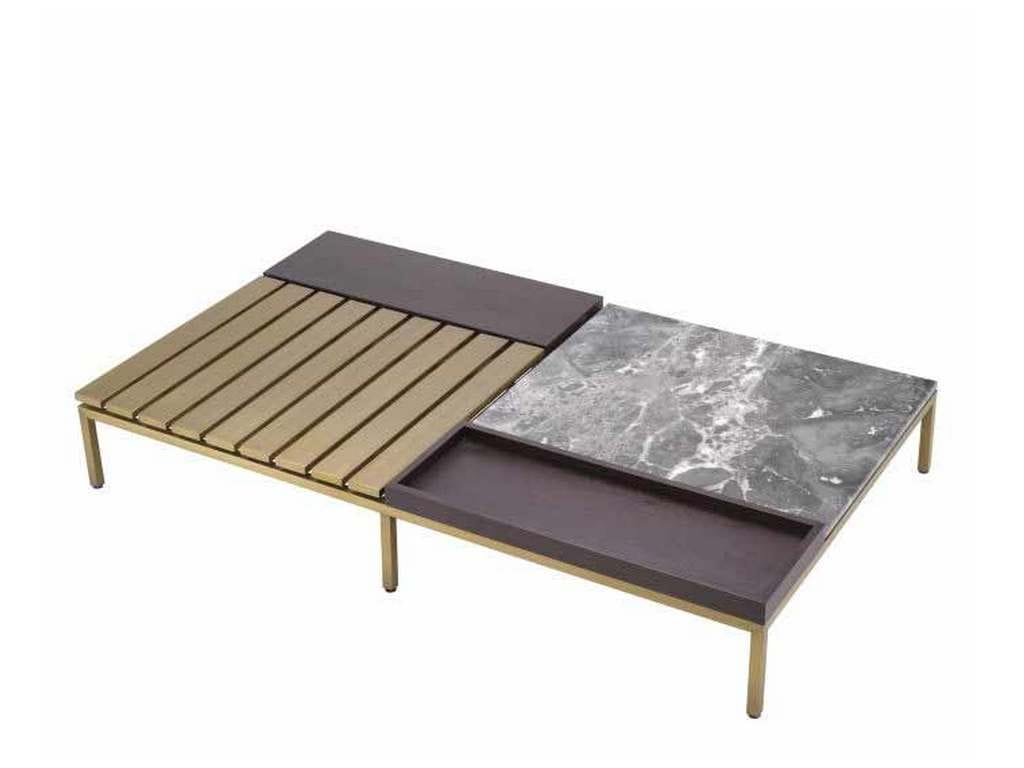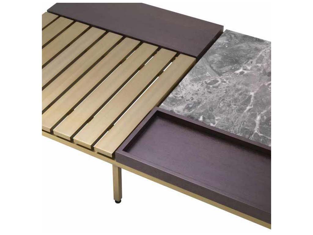 Product Description: Eichholtz 116087 Coffee Table Forma - Brushed brass finish, grey marble and brown oak veneer. Marble is a natural material, each piece differs in color and veining. Coffee Table Forma stands out thanks to a sophisticated mix of materials, patterns and colours. The grey marble and the brown oak veneer with grain pattern contrast beautifully with the smooth plain slatted top with brushed brass finish. A slight difference in level adds extra dimension to this sleek piece of furniture.