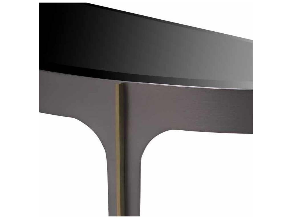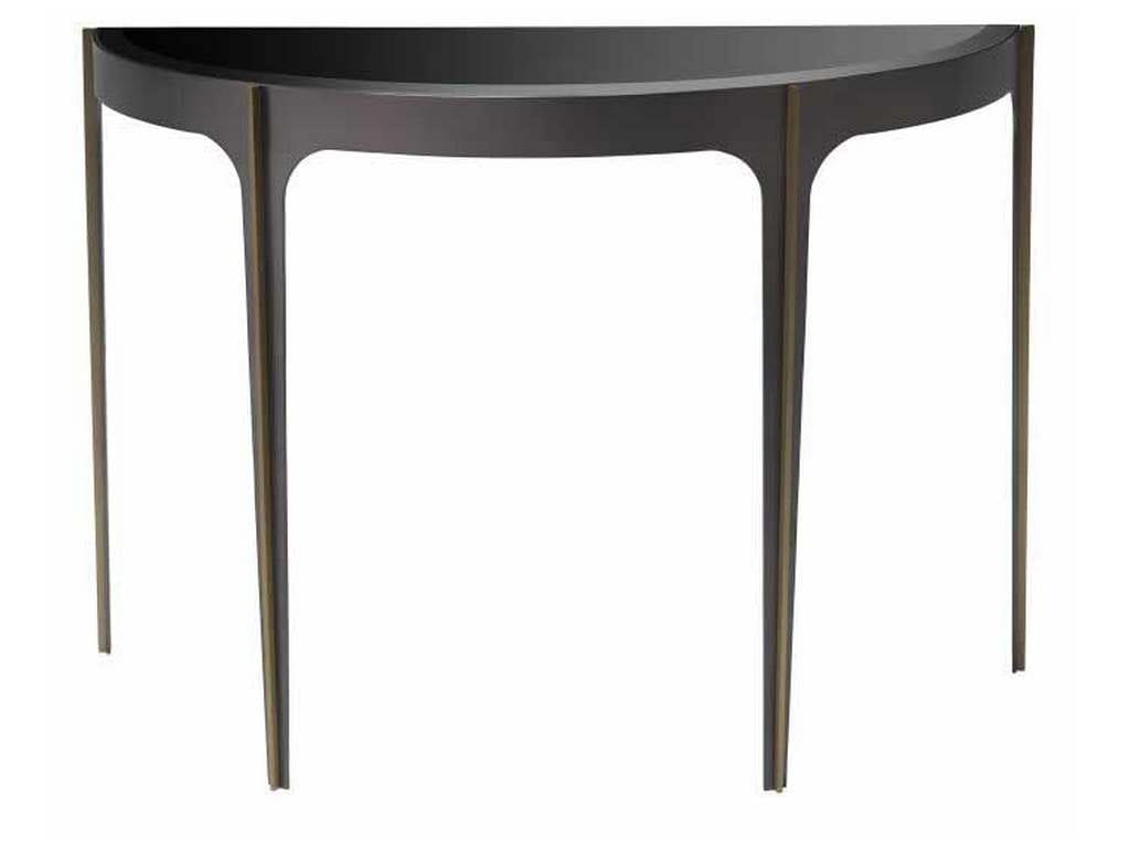 Product Description: Eichholtz 116104 Console Table Artemisa - Featuring a Mid-Century Modern design and a chic appeal, Console Table Artemisa makes a statement with its elegant frame in a bronze finish. The interior curves of the frame are accentuated by sleek brushed brass bars on the legs and a semi-circular tabletop of bevelled black glass, bringing focus to the spaciousness within the solid materials shaping this piece.