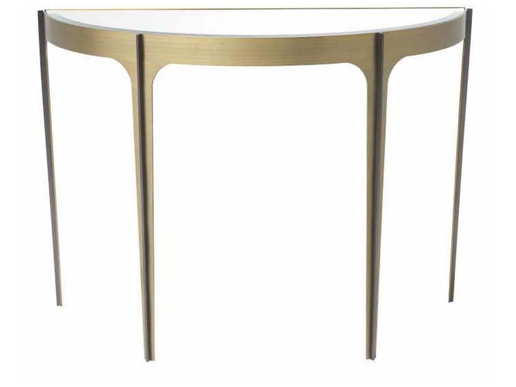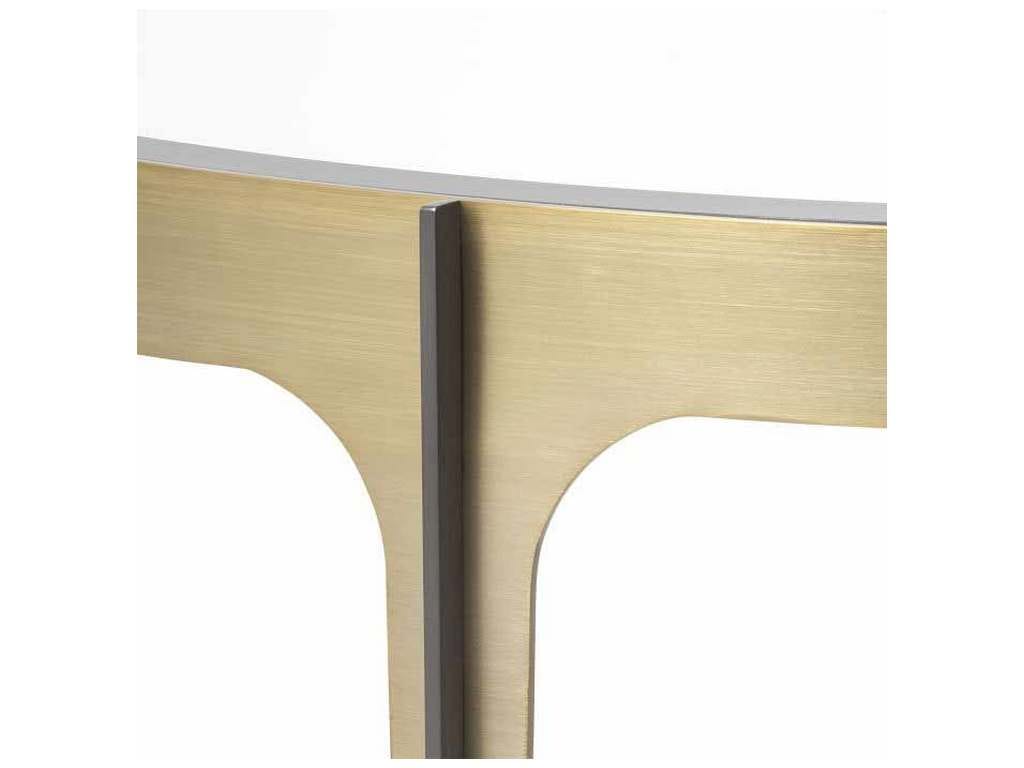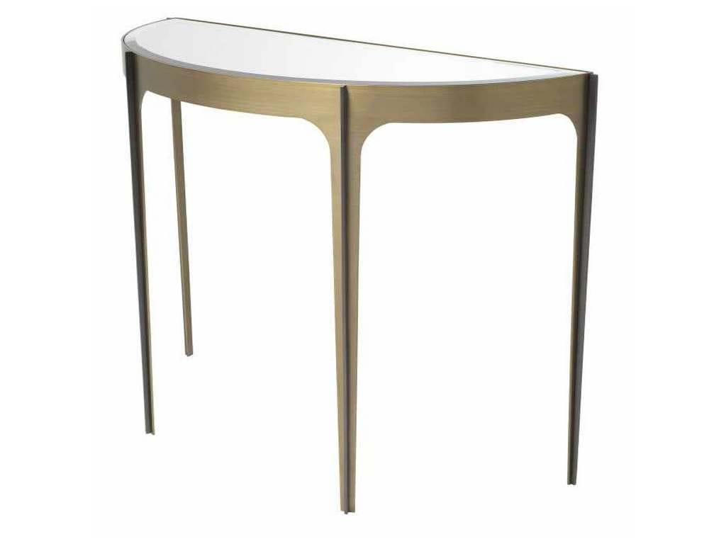 Product Description: Eichholtz 116141 Console Table Artemisa - Featuring a Mid-Century Modern design and a chic appeal, Console Table Artemisa makes a statement with its elegant frame in a brushed brass finish. The interior curves of the frame are accentuated by sleek bronze bars on the legs and a semi-circular tabletop of bevelled mirror glass, bringing focus to the spaciousness within the solid materials shaping this piece.