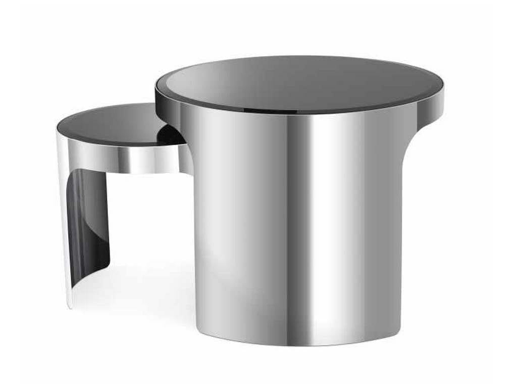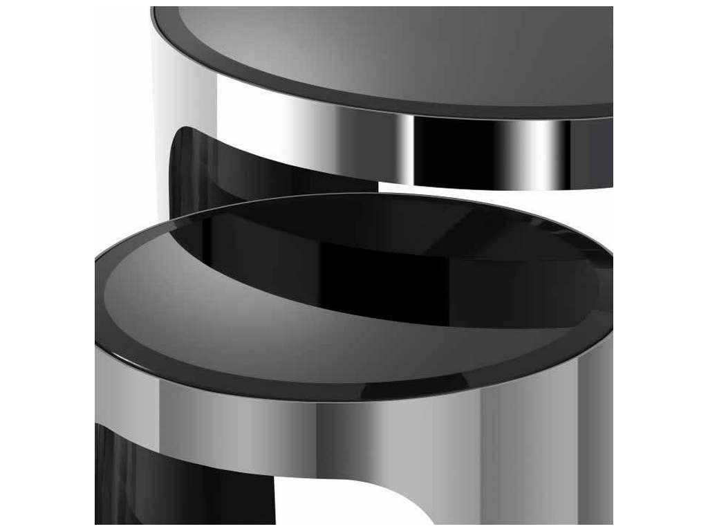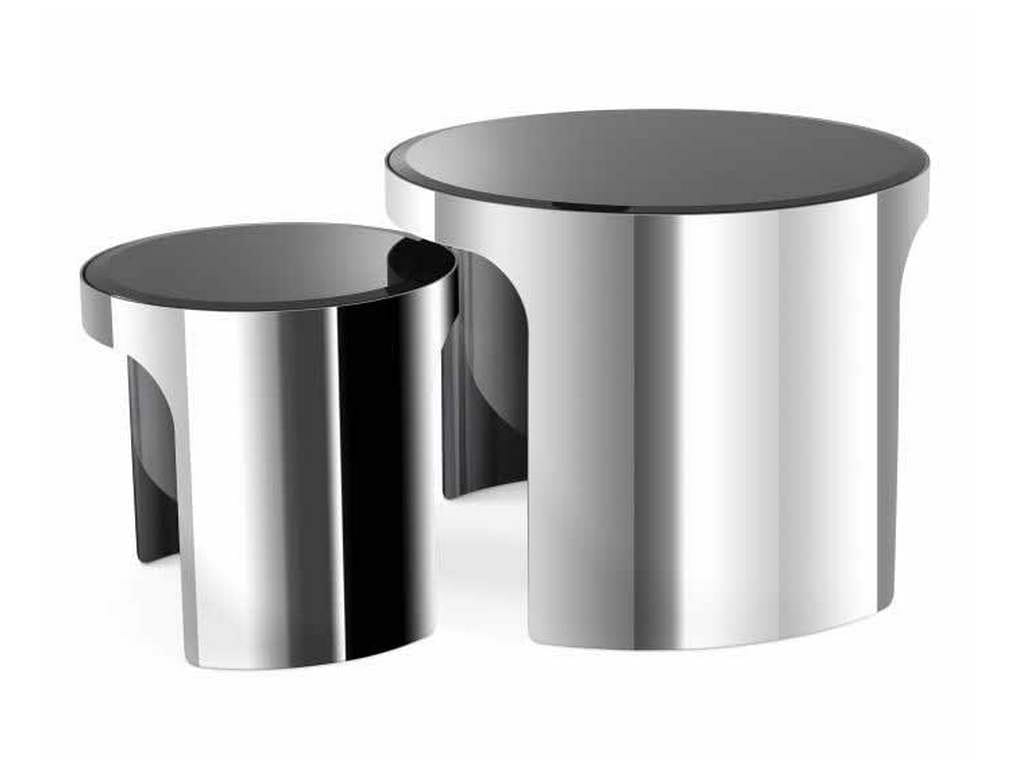 Product Description: Eichholtz 116541 Side Table Piemonte Set of 2 - Set of 2 side tables made of black glass tops and stainless steel bases. Sleek and contemporary design. Can be used together or separately. Large table: 20" D x 22" H. Small table: 16" D x 20" H.