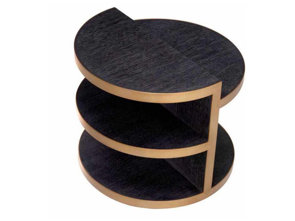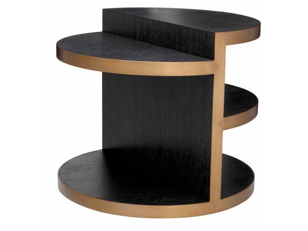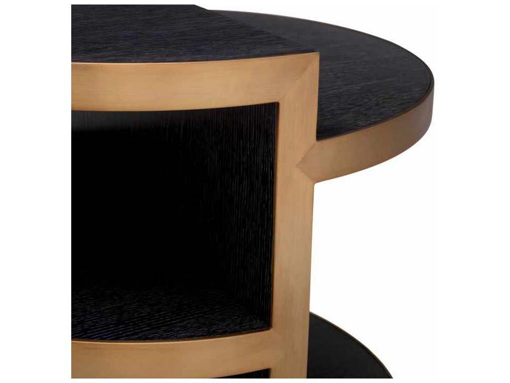 Product Description: Eichholtz 117331 Side Table Nilo - Side table with a black glass top and a brushed brass base. Elegant and timeless design. Perfect for adding a touch of sophistication to any space. Measures 18" in diameter and 24" in height.