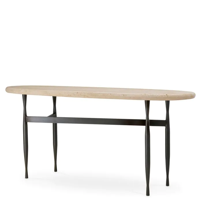 Product Description: Eichholtz 118524 Console Table Palermo - Introducing the Palermo Console Table, a striking blend of timeless elegance and modern sophistication. Crafted with meticulous attention to detail, this console table features a bronze-finished base that exudes warmth and character. The travertine top adds a touch of luxury, with its natural veining and texture creating a captivating focal point in any space. Whether placed in an entryway, hallway, or living room, the Palermo Console Table makes a statement with its sleek design and refined craftsmanship. Elevate your home décor with the understated sophistication of the Palermo Console Table.