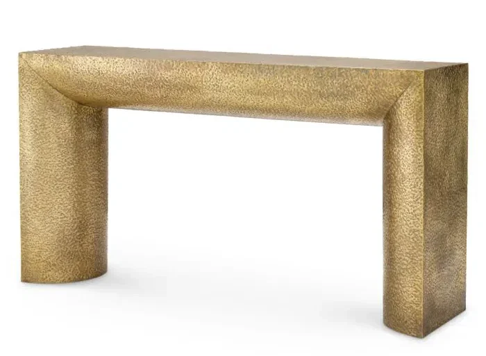 Product Description: Eichholtz 119319 Console Table Drayton - From a distinguished artisanal Eichholtz collection, the Drayton highlights the striking character of hand-hammered craftsmanship, finished in warm vintage brass for a rich golden radiance. Each gentle indentation reflects the artisan’s skill, adding texture, depth, and unique personality. Luxurious and welcoming, it makes a bold and captivating centerpiece for your living room.
