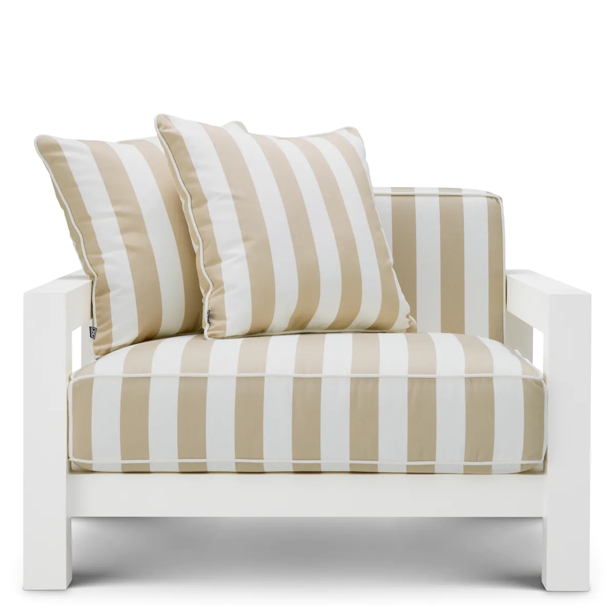 Product Description: Eichholtz 119580 Outdoor Chair Cap Antibes - Immerse yourself in luxury with the Outdoor Chair Cap-Antibes. Featuring a matte white aluminum frame and plush Florent beige cushions, this chair harmonizes elegance and resilience. The striped pattern, crafted from 100% solution-dyed acrylic, exudes sophistication, making it a perfect addition to any upscale outdoor setting. Indulge in unparalleled relaxation and style.
