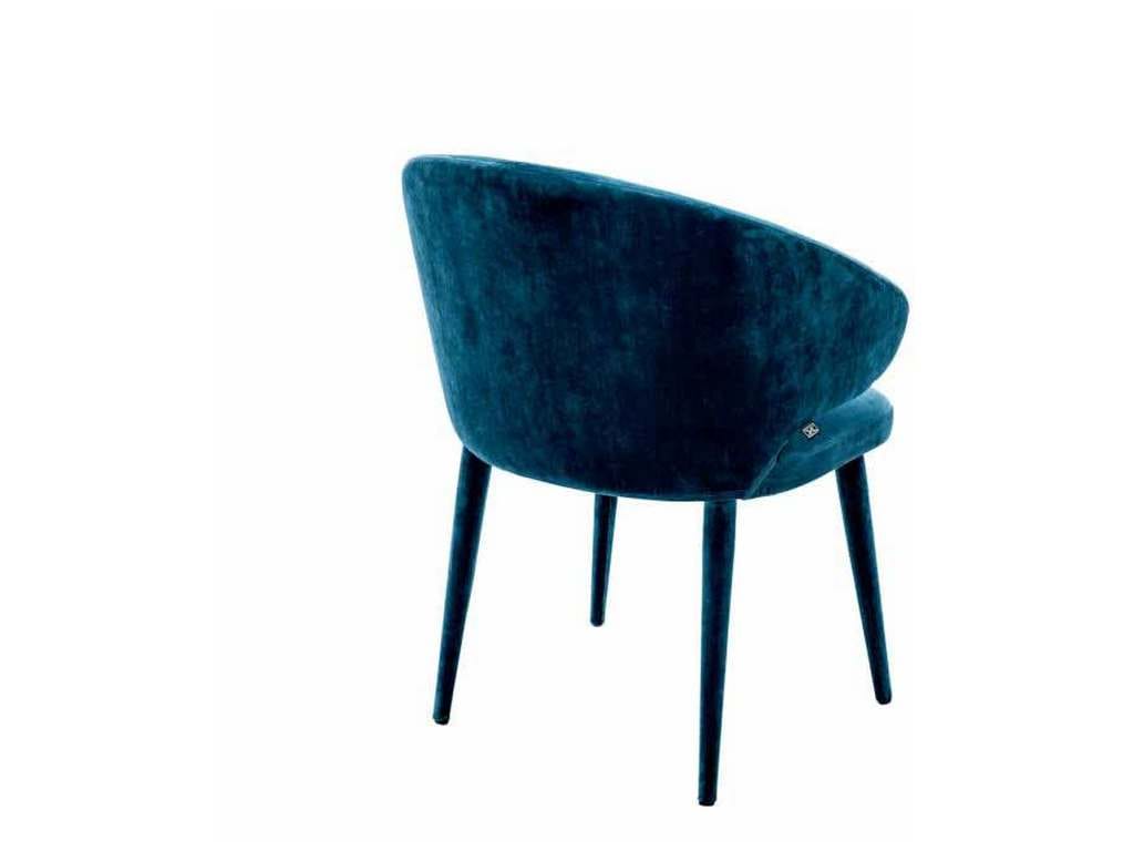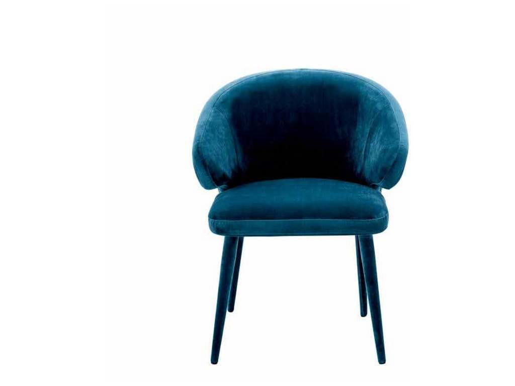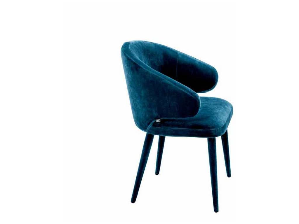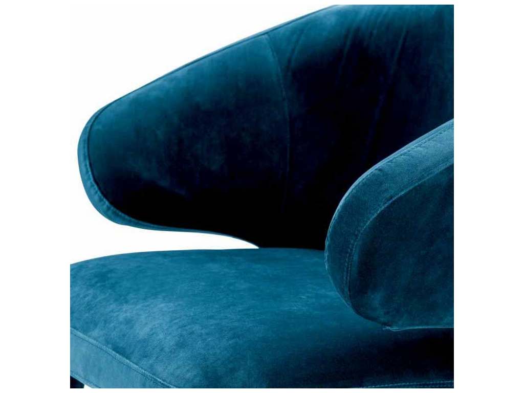 Product Description: Eichholtz A112067 Dining Chair Cardinale - Host your guests in style with the Cardinale Dining Chair. The bent backrest and tapered legs feature a Roche teal blue velvet upholstery and give this eye-catching armchair a sense of Mid-Century Modern flair.