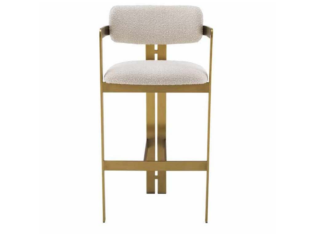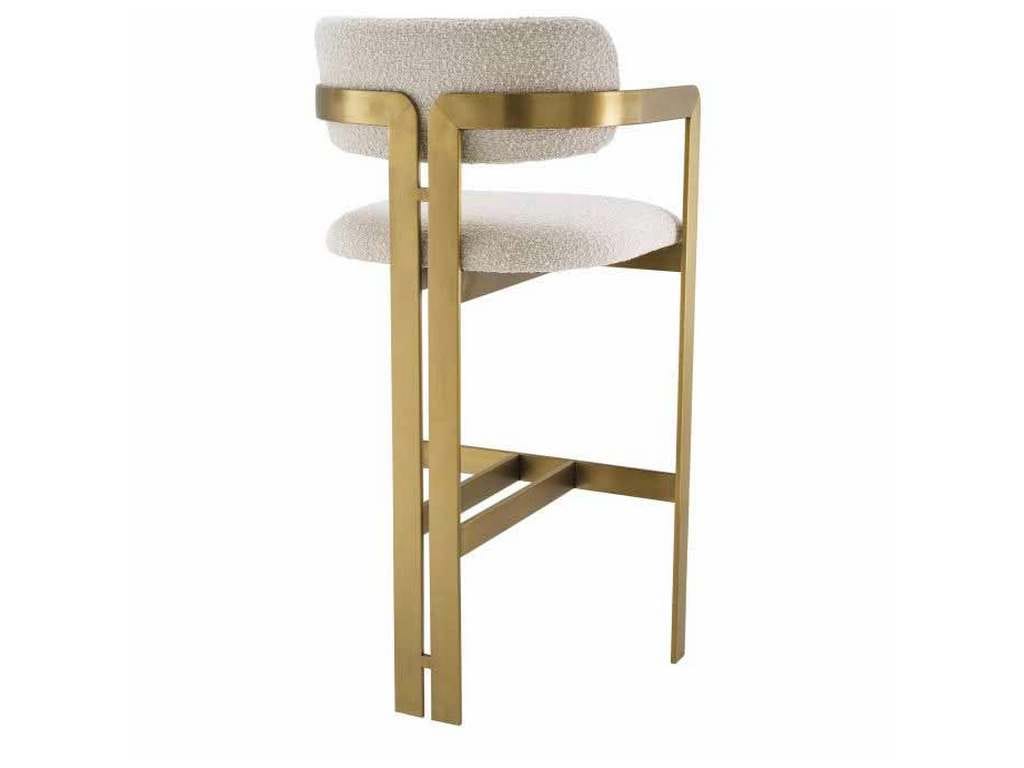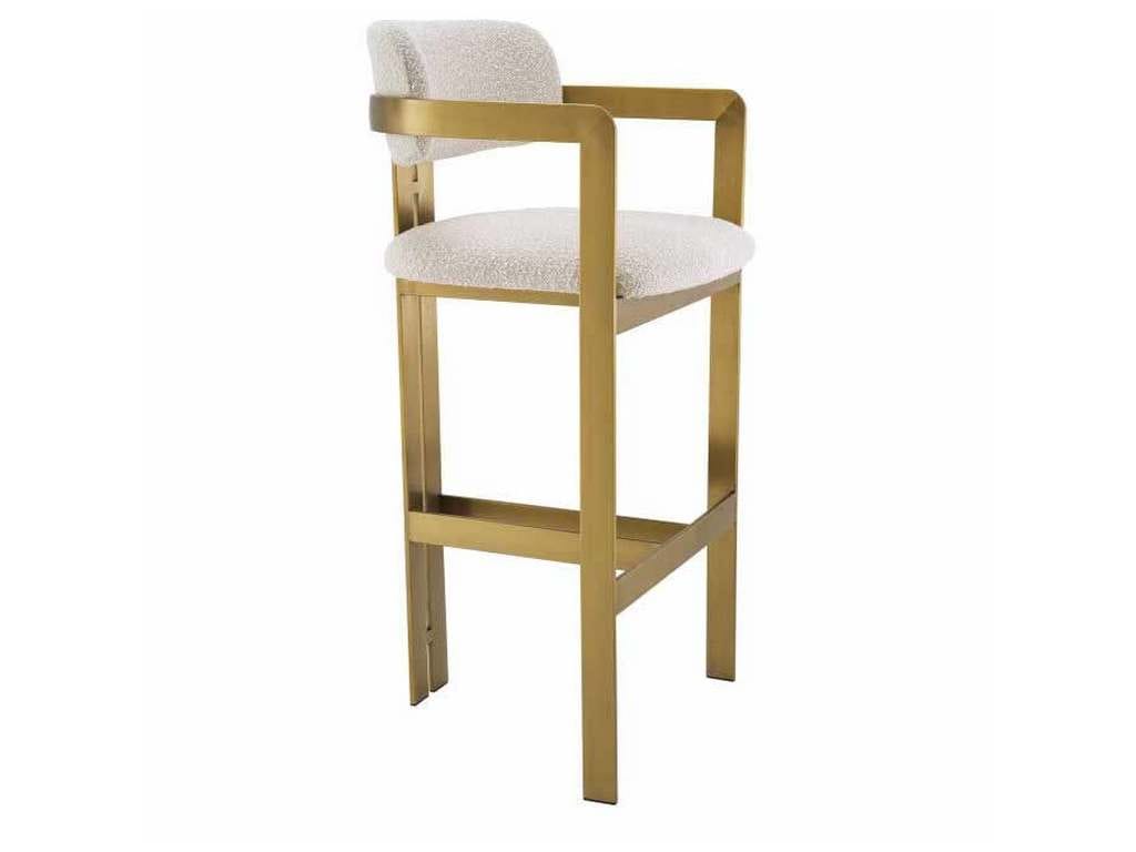 Product Description: Eichholtz A115048 Bar Stool Donato - Inviting and refined with a hint of retro design, the Donato Counter Stool will add a touch of vintage style to any space. Featuring a geometric brushed brass frame with a circular seat and curved backrest in a Boucle cream upholstery, this bar stool pairs comfort with functionality.