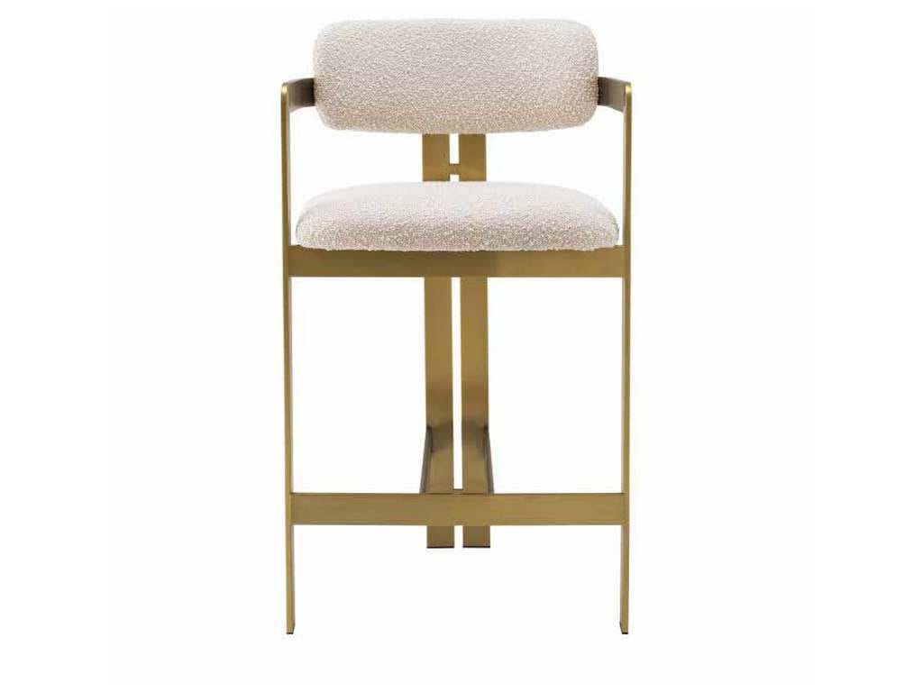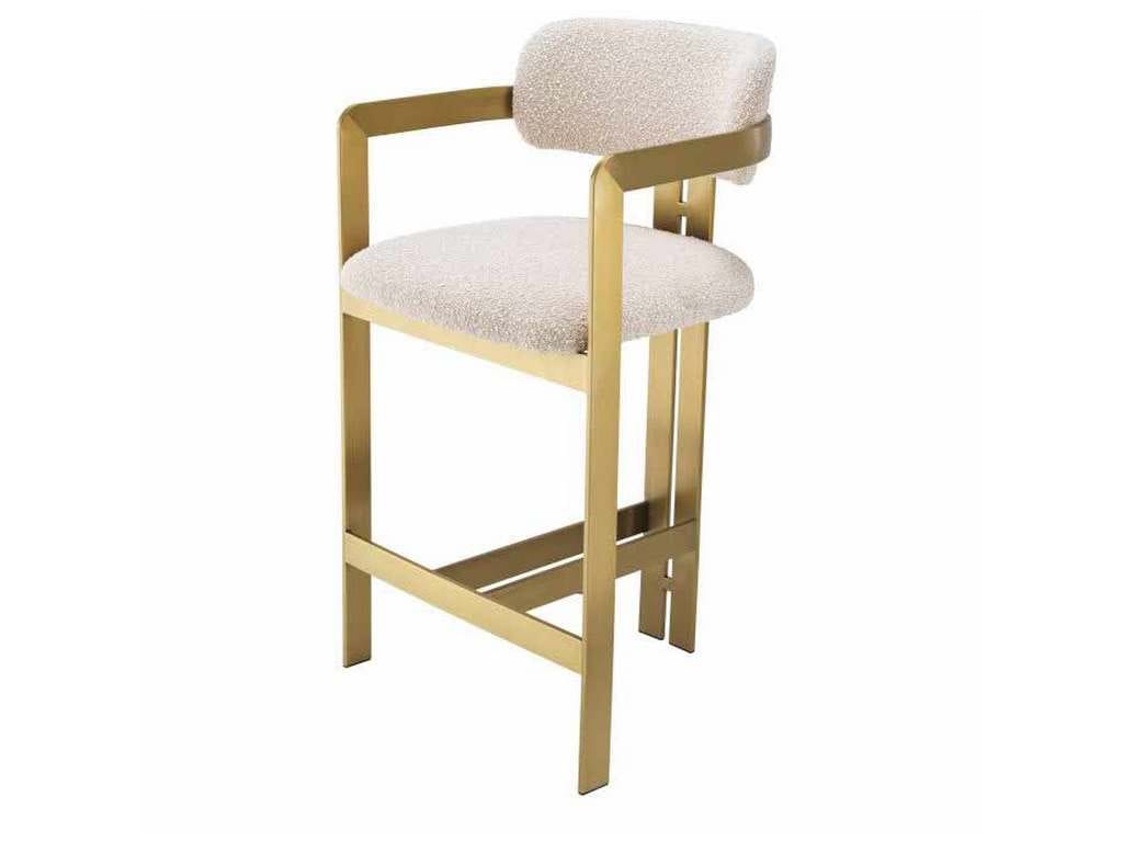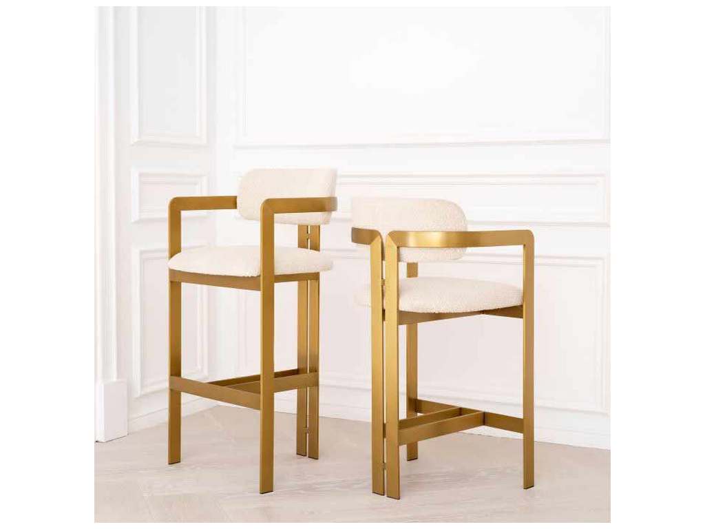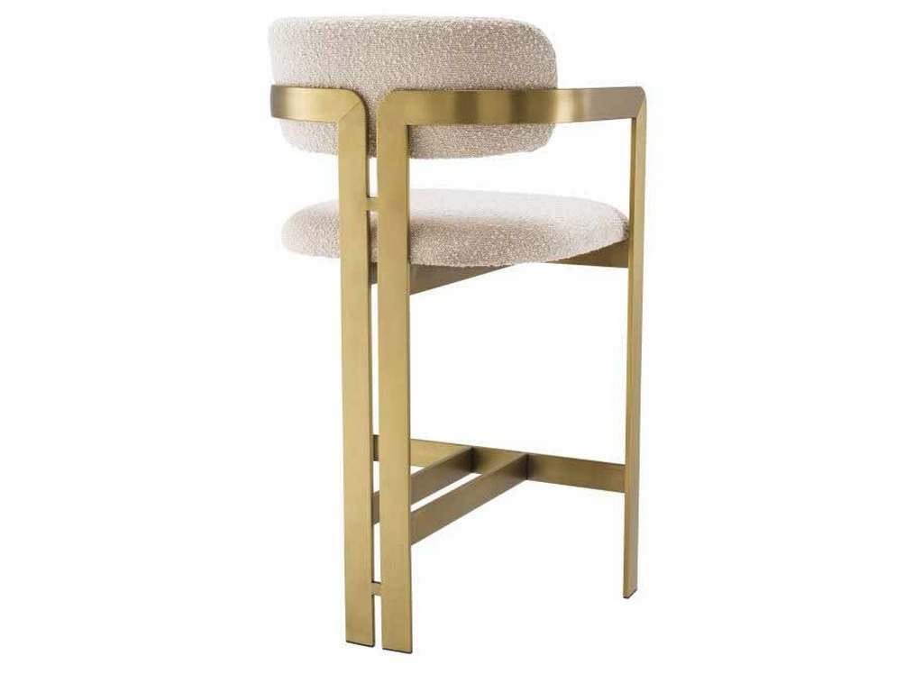 Product Description: Eichholtz A115049 Counter Stool Donato - Inviting and refined with a hint of retro design, the Donato Counter Stool will add a touch of vintage style to any space. Featuring a geometric brushed brass frame with a circular seat and curved backrest in a Boucle cream upholstery, this counter stool pairs comfort with functionality.