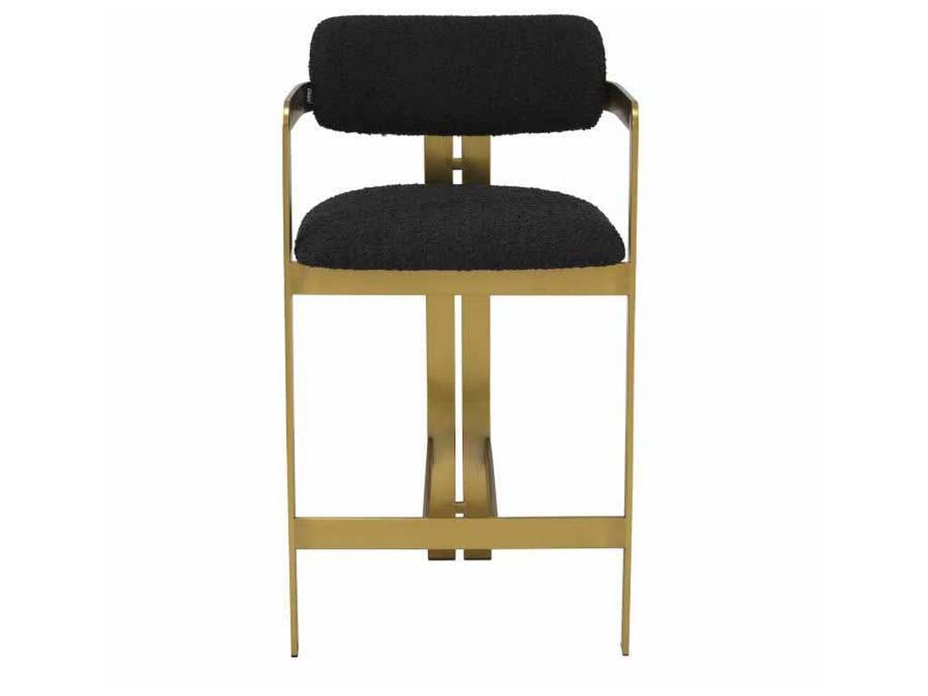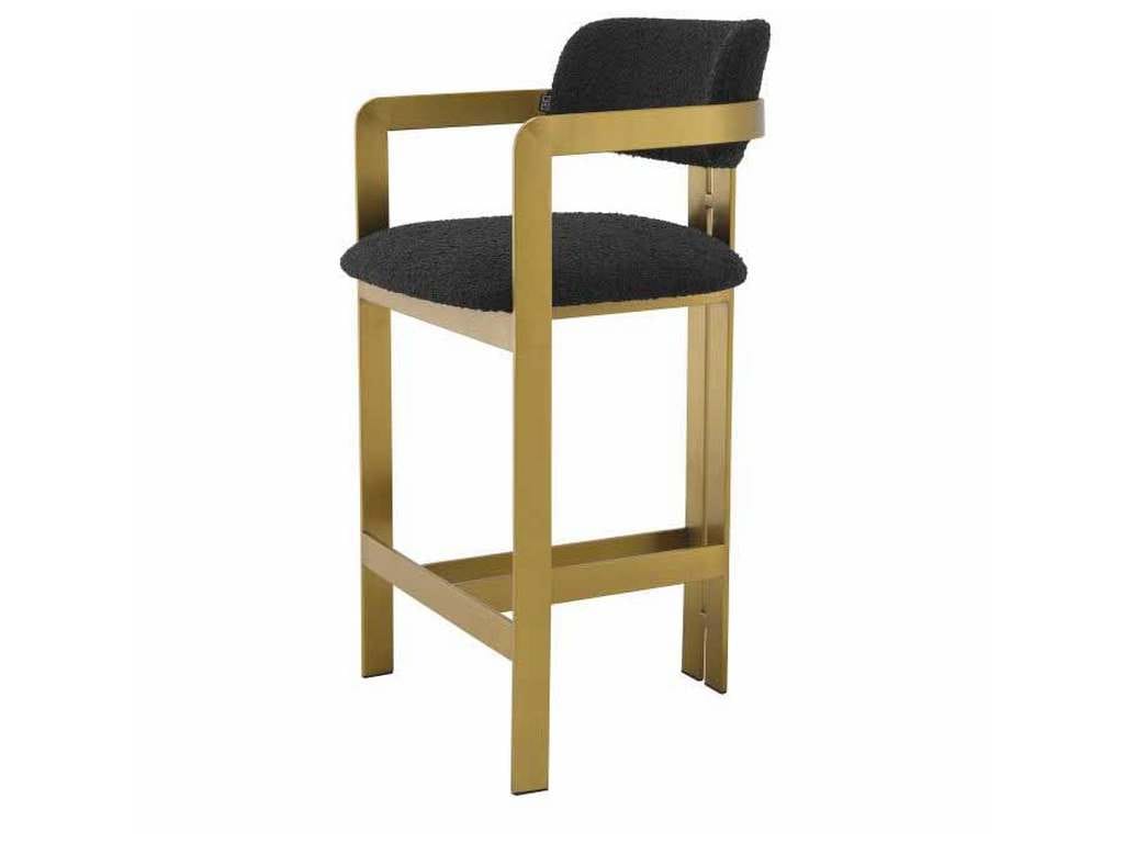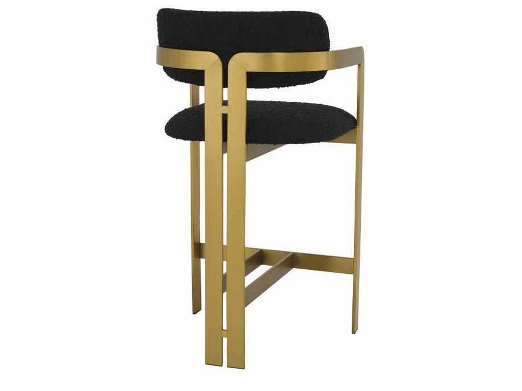 Product Description: Eichholtz A115836 Counter Stool Donato - Inviting and refined with a hint of retro design, the Donato Counter Stool will add a touch of vintage style to any space. Featuring a geometric brushed brass frame with a circular seat and curved backrest in a Boucle black upholstery, this counter stool pairs comfort with functionality.