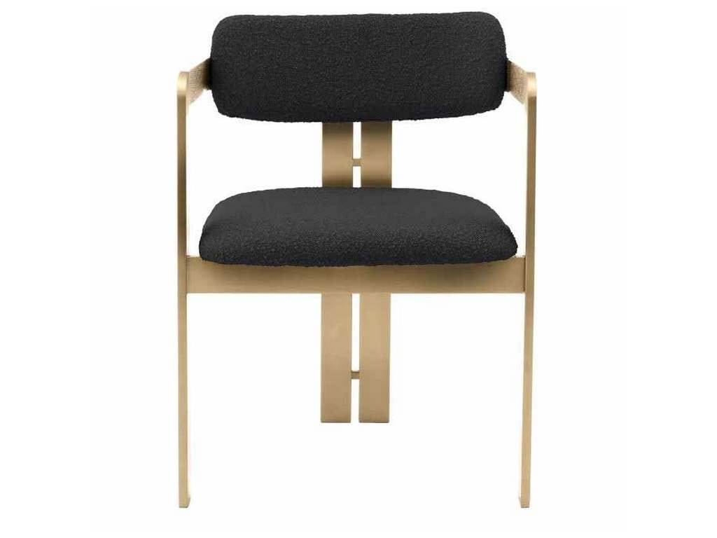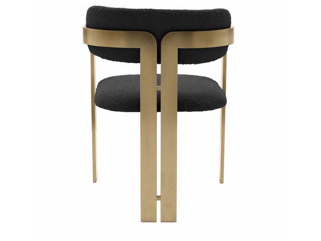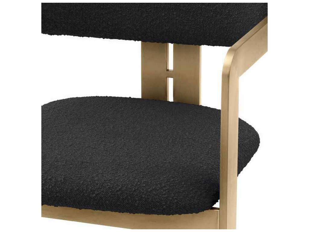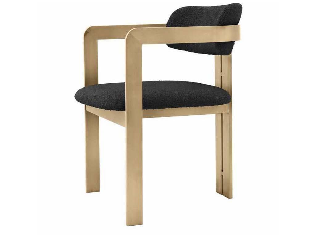 Product Description: Eichholtz A116347 Dining Chair Donato - Bring a modern touch to your dining arrangement with the Donato Dining Chair. Bound to be a talking point for guests, this stylish accent chair offers a unique design with two armrests that merge into the front two legs and two rear legs that support the rounded backrest. The frame features a brushed brass finish and the seat is upholstered in Boucle black.