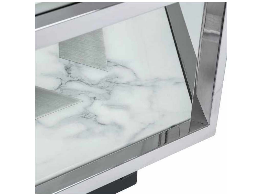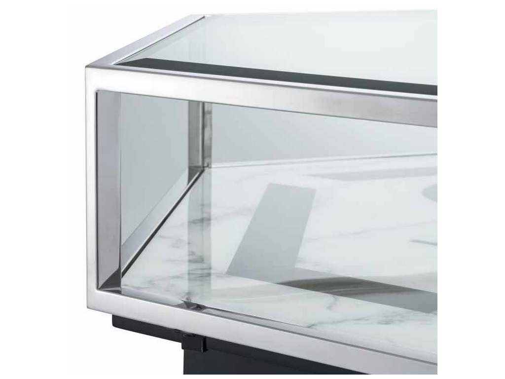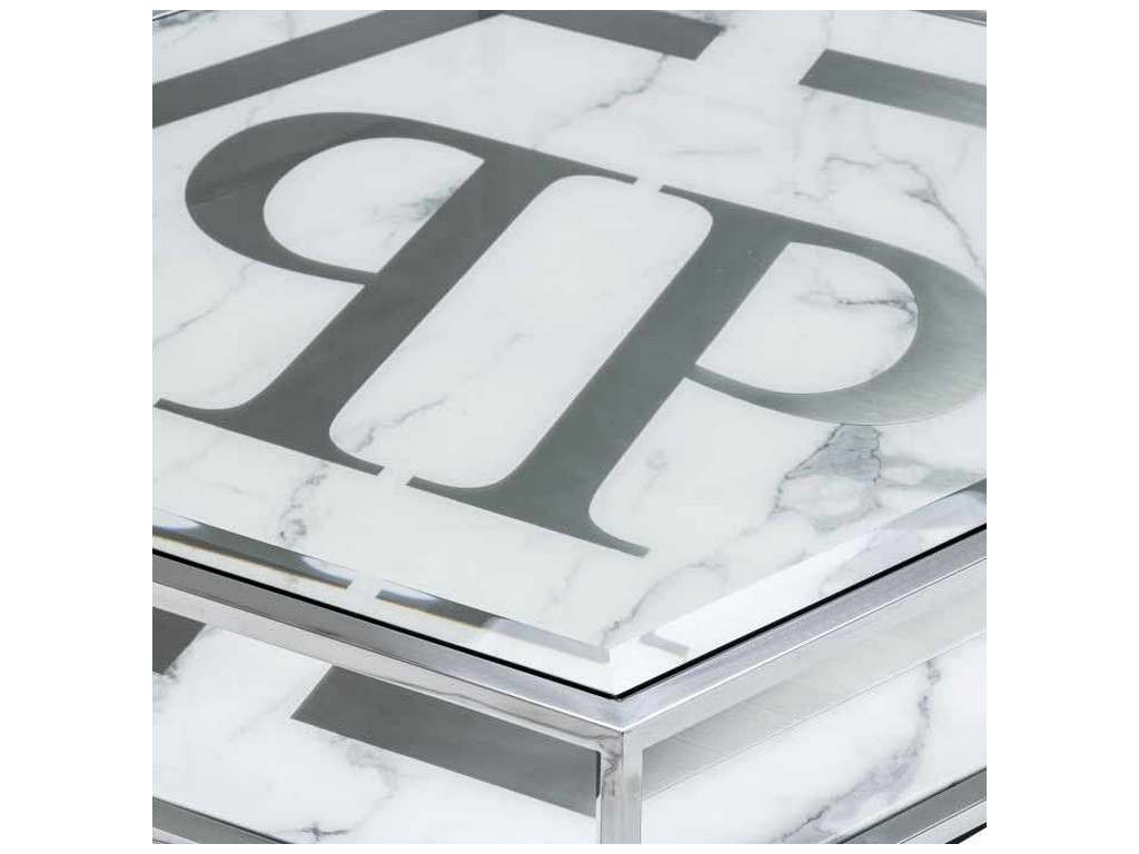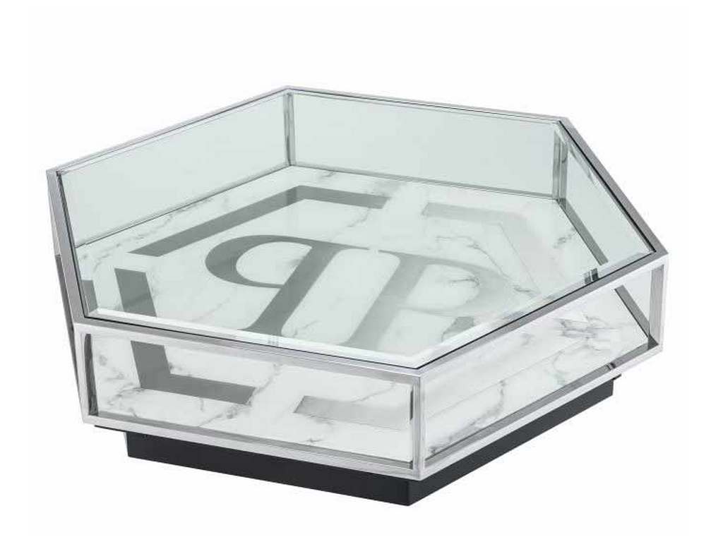 Product Description: Eichholtz PP0197 Coffee Table Falcon View - White faux marble, brushed nickel logo - clear glass - polished nickel base. The Falcon View coffee table, with echoes of Italian 70s styling, has been crafted in faux white marble and trimmed with a silver finish and a beveled glass top to draw attention to the Philipp Plein signature hexagon silhouette and logo.