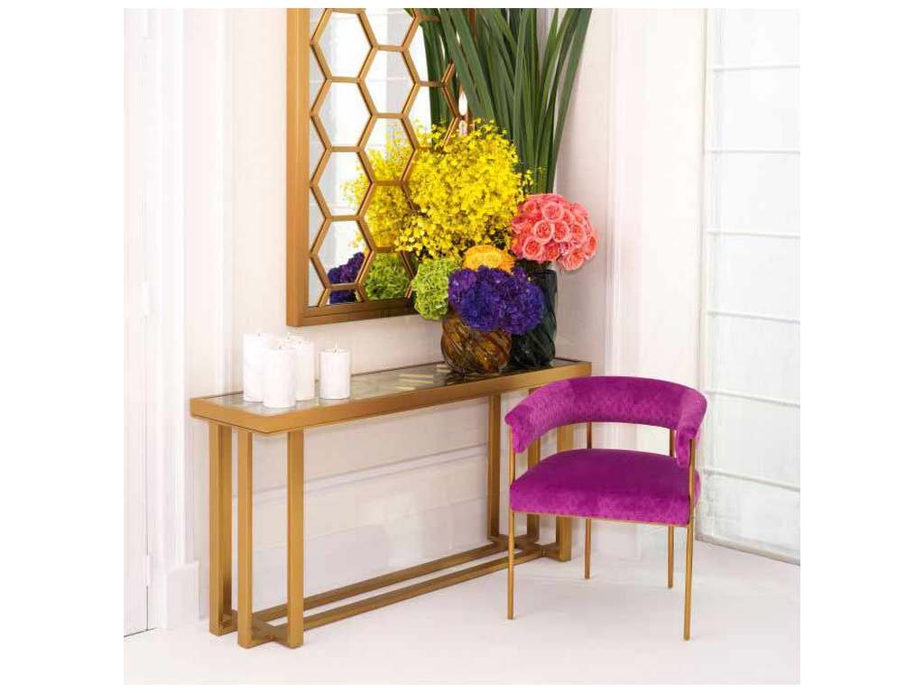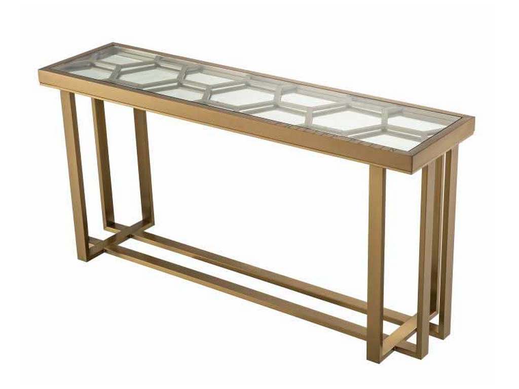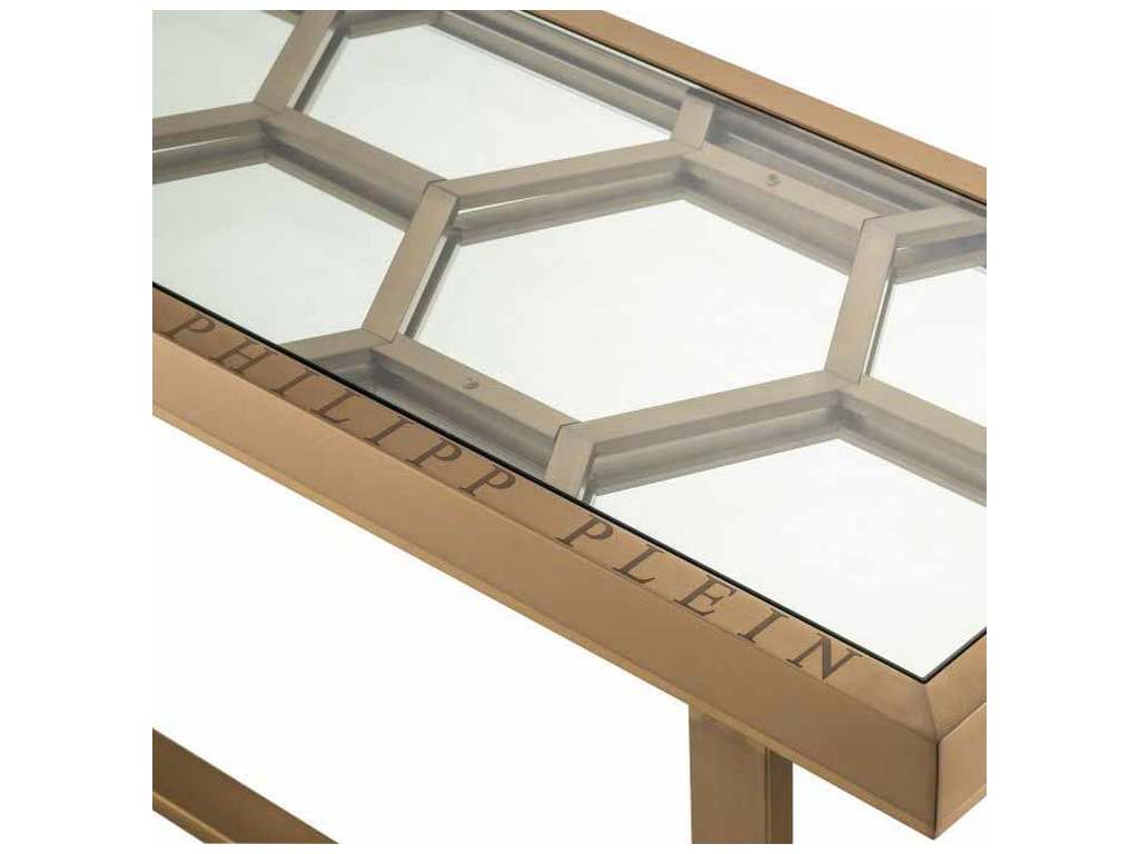 Product Description: Eichholtz PP0266 Console Table Skeleton - Ideal for the entrance hall or a corridor, the Skeleton console table with its antique brass frame takes inspiration from vintage 70s Italian design but is reimagined for now by Phillip Plein with his hexagonal motif and a smoked glass top.