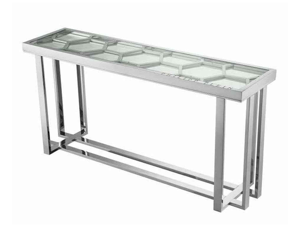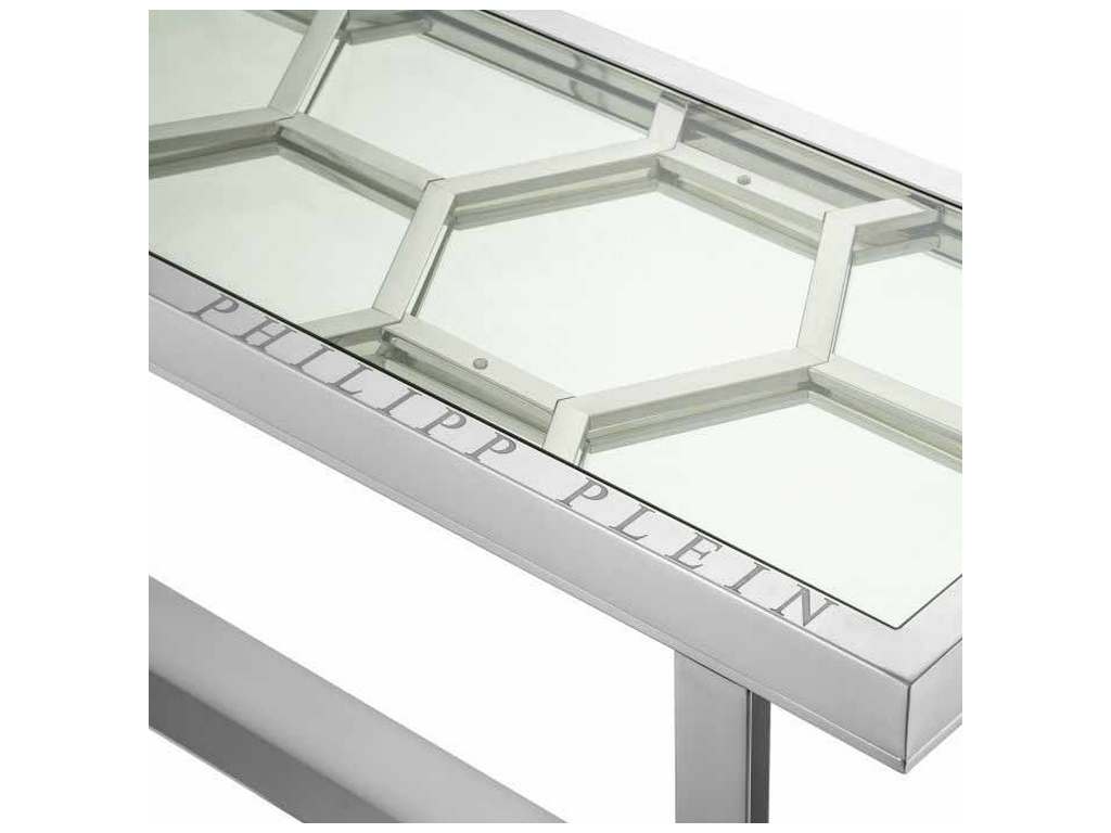 Product Description: Eichholtz PP0268 Console Table Skeleton - For the sleekest first impression, the polished nickel Skeleton console table with its hexagonal motif, engraved Philipp Plein branding and glass top is ideal for a luxurious and contemporary entrance hall or corridor.