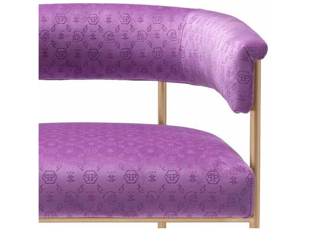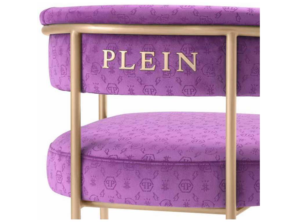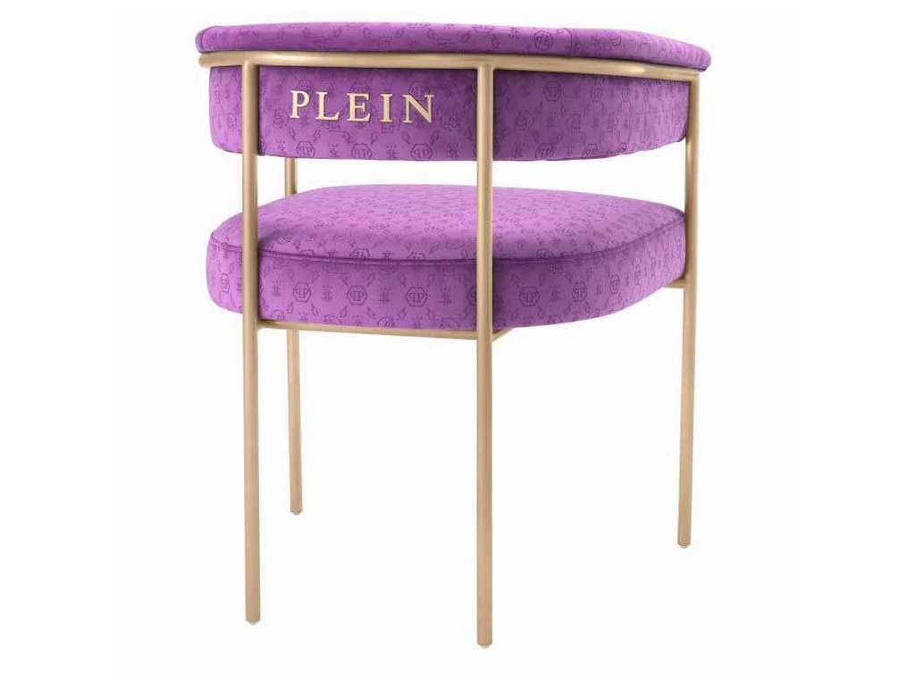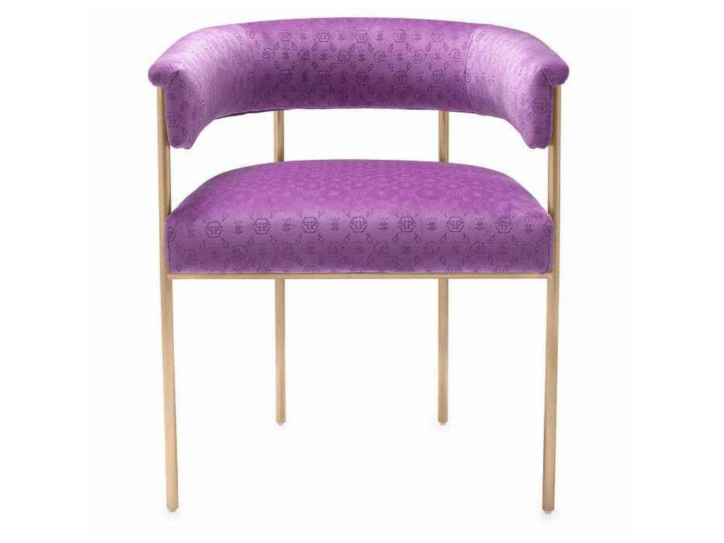 Product Description: Eichholtz PPA0038 Dining Chair Monogram - The Monogram dining chair, with custom, laser-cut logo velvet upholstery makes a strong statement in saturated purple. The antique brass finish brings a touch of elegance for decadent entertaining around the dinner table.