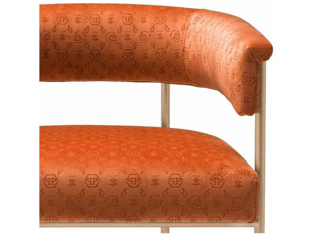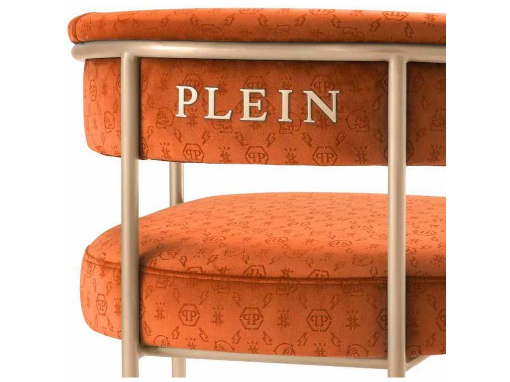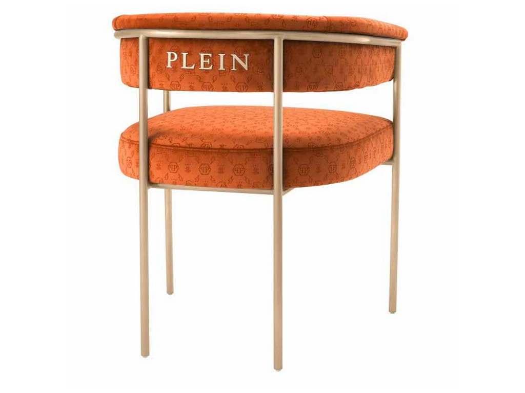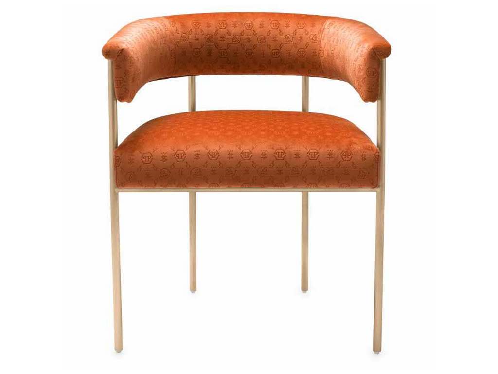 Product Description: Eichholtz PPA0039 Dining Chair Monogram - Upholstered in custom, laser-cut logo rich velvet, the Monogram dining table in hot orange feels decadent and uplifting against the antique brass finish frame. This is decadent dining at its best.