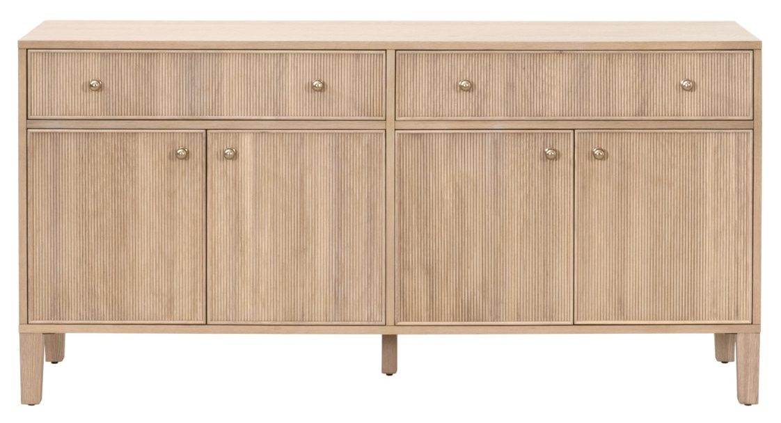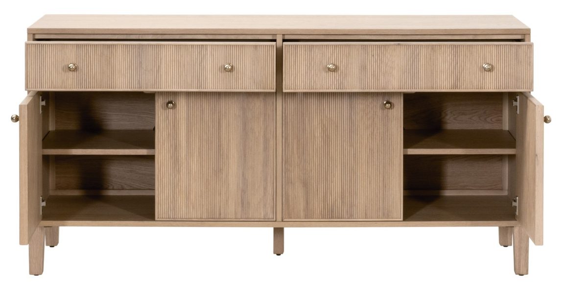 Product Description: Essentials For Living 5264.NAT-OAK Highland Media Sideboard - Fluted Wood Drawer Front Detail. Solid Iron Drawer Knobs. Felt-Lined Drawers. Dual 3/4 Undermounted, Soft-Close Metal Drawer Glides. Two Storage Cabinets. Cord Management Holes in Each Cabinet. Removable & Adjustable Shelf in Each Cabinet.