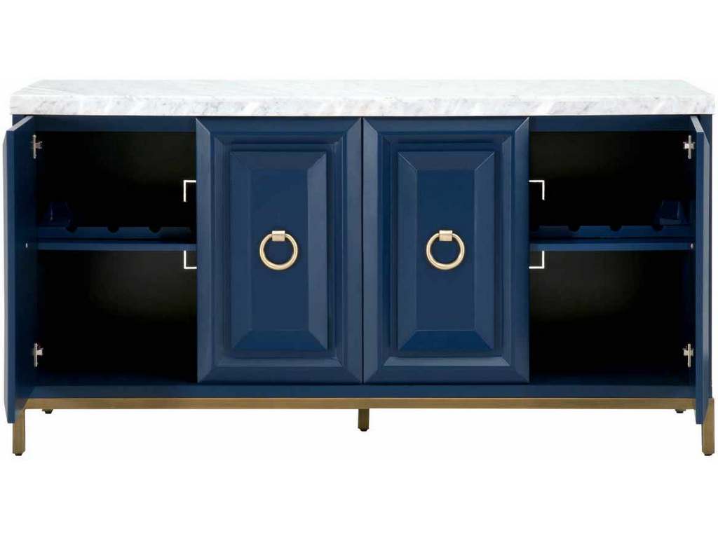 Product Description: Essentials For Living 6087.NAV-BGLD/WHT Azure Carrera Media Sideboard in White Carrera Marble Navy Blue Brushed Gold - Essentials For Living 6087.NAV-BGLD/WHT Azure Carrera Media Sideboard in White Carrera Marble, Navy Blue, Brushed Gold - Genuine Carrera Marble Veneer Top. Two Removable 7-Bottle Capacity Wine Racks. Cord Management Holes in Each Cabinet. Two 11-Position Adjustable Shelves. Heavy Duty Threaded Shelf Pins. Metal Base and Ring Pulls. Fully Adjustable Door Hinges. Feet Levelers. Tip Kit Included.