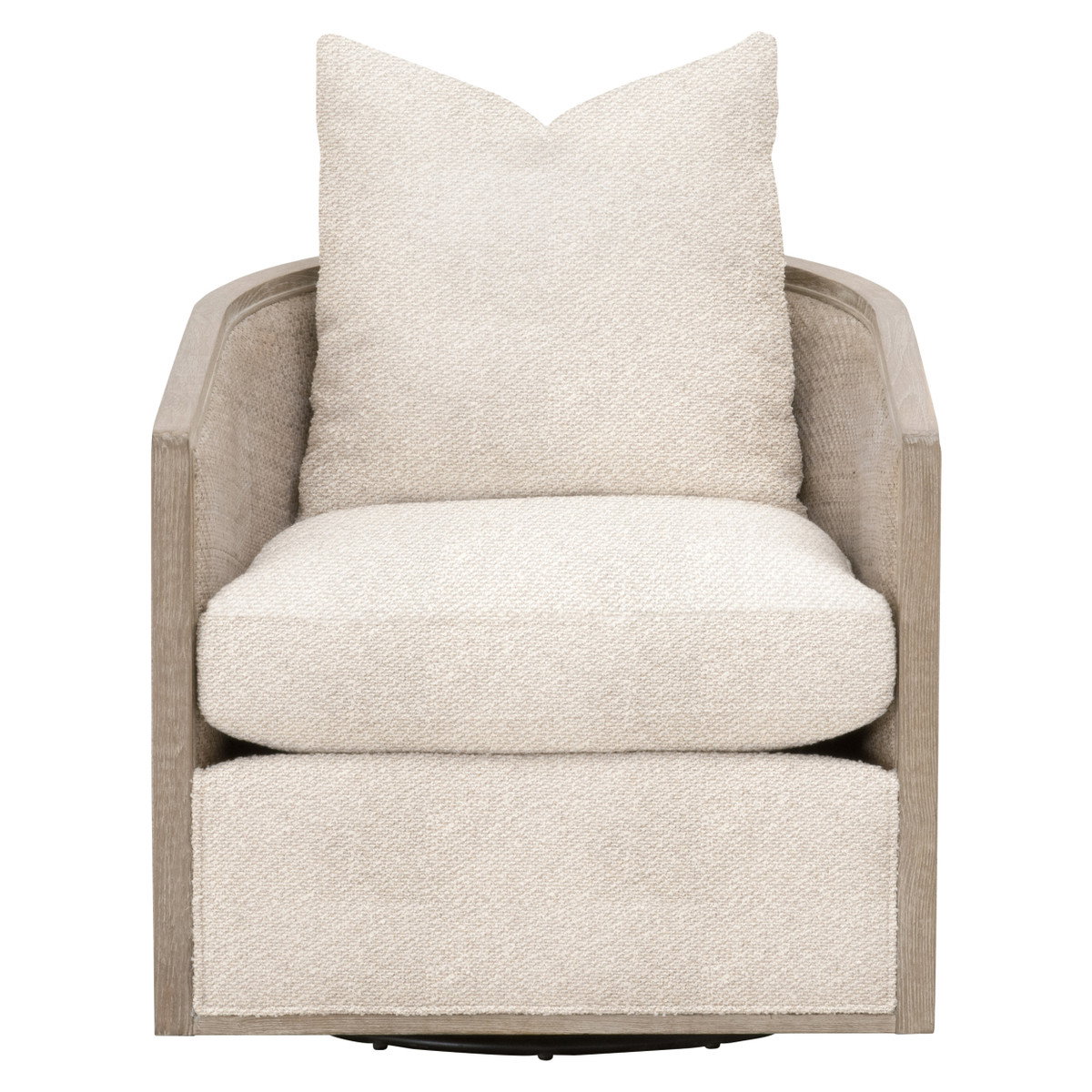 Product Description: Essentials For Living 6643.LGLIN/NG McGuire Swivel Club Chair - LiveSmart Gellar-Jute, Natural Gray Oak & Cane. Cane Wrapped Surround Detail. 360° Swivel Chair. 1 Square Throw Pillow Included