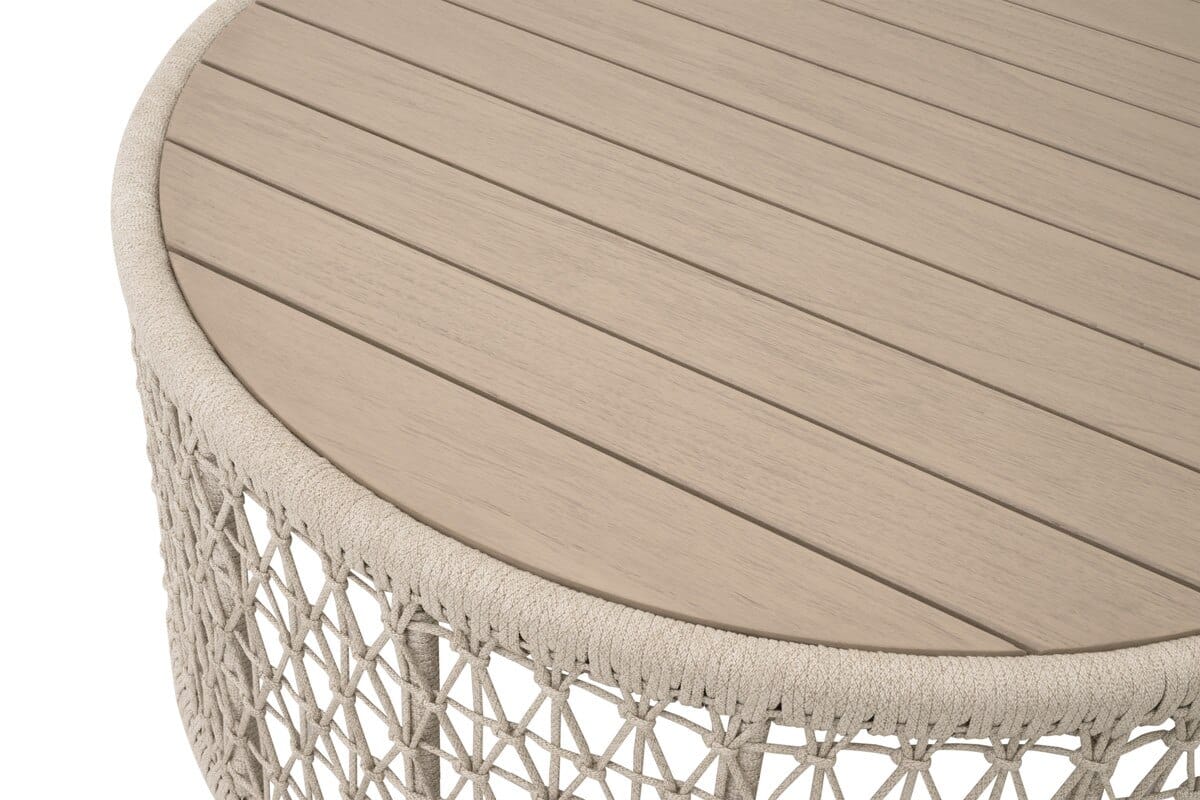 Product Description: Essentials For Living 6888.OAT/W-ET Knit Outdoor Round Coffee Table - Round coffee table with a knit surface for outdoor lounging. Lightweight design for easy mobility. Adds a functional element to outdoor seating areas.