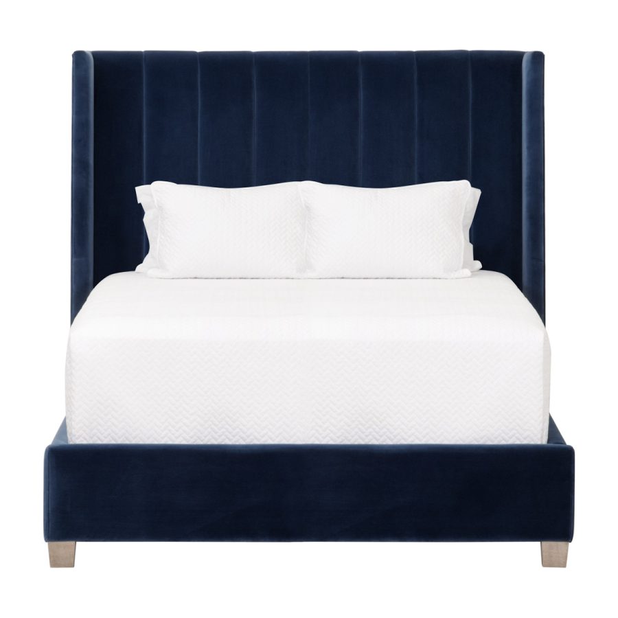 Product Description: Essentials For Living 7127-1.DEN/NG Chandler Queen Bed - Wing Headboard Design. Vertical Channel Stitching. Edge Piping Detail. Solid Oak Legs. Removable Metal Frame European Slat System
