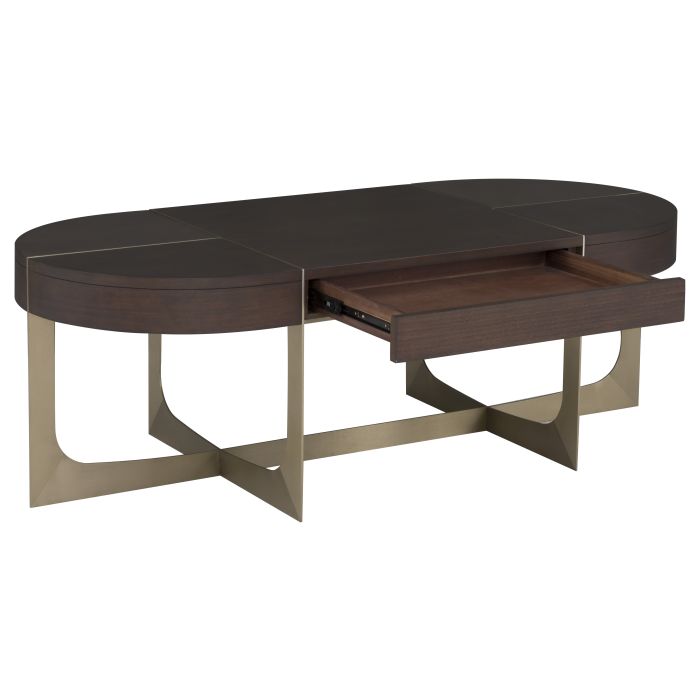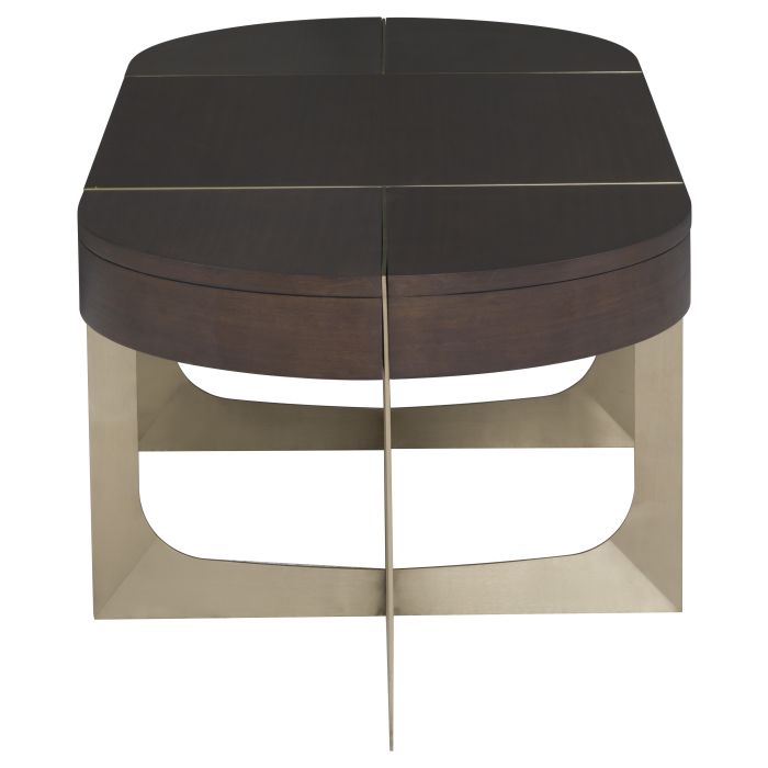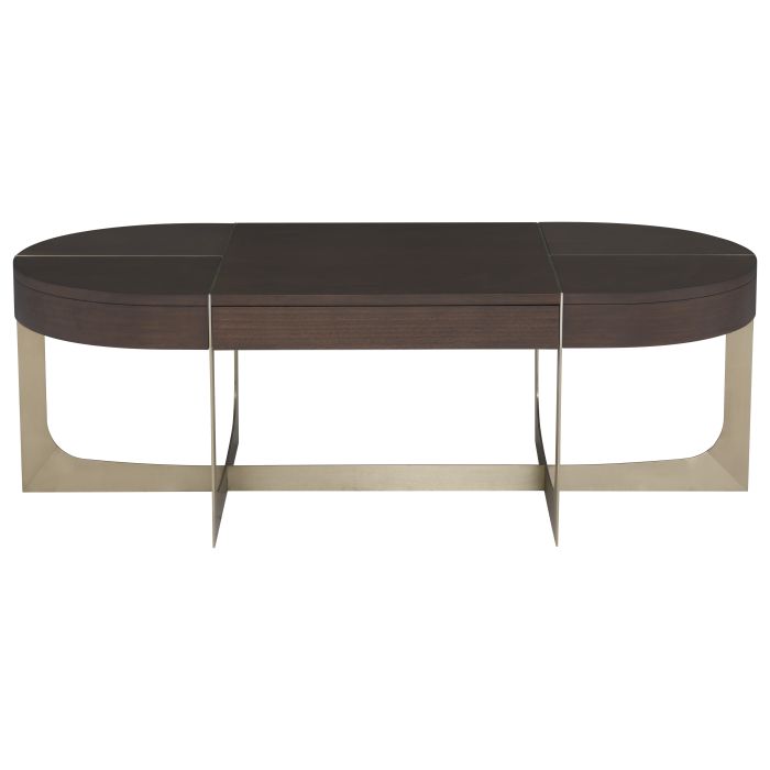 Product Description: Fairfield 6360-13 Libby Langdon Goddard Oval Cocktail Table - Stainless steel base and inlay accents in Champagne Finish on metal and Smoked Stone finish on wood. Sleek and stylish, the Goddard collection is classic yet contemporary, the eucalyptus veneer really shines in the rich smoked stone wood finish. The subtle and slight brushed champagne brass details add interest to the top while the metal takes an interesting shape to form the legs and the base.