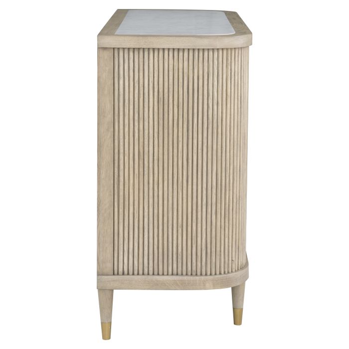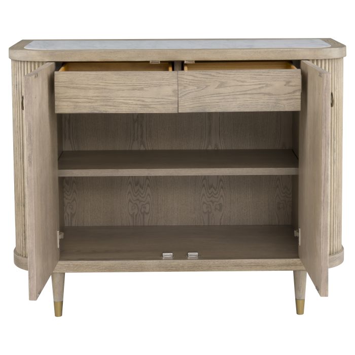 Product Description: Fairfield 8030-82 Everett Two Door Demilune Credenza - Features two doors, two interior drawers and one adjustable shelf. Inset White Carrara stone top Brushed Brass hardware and ferrules.