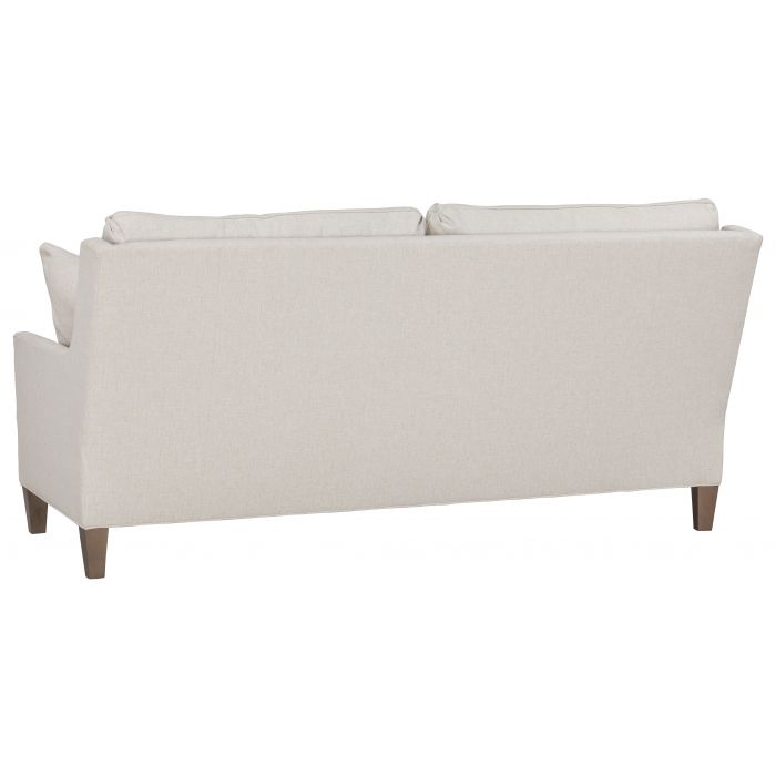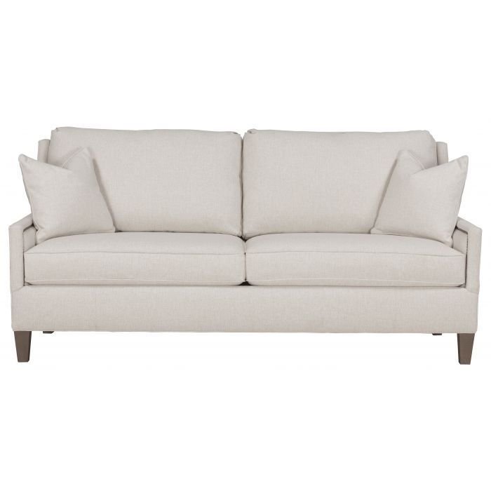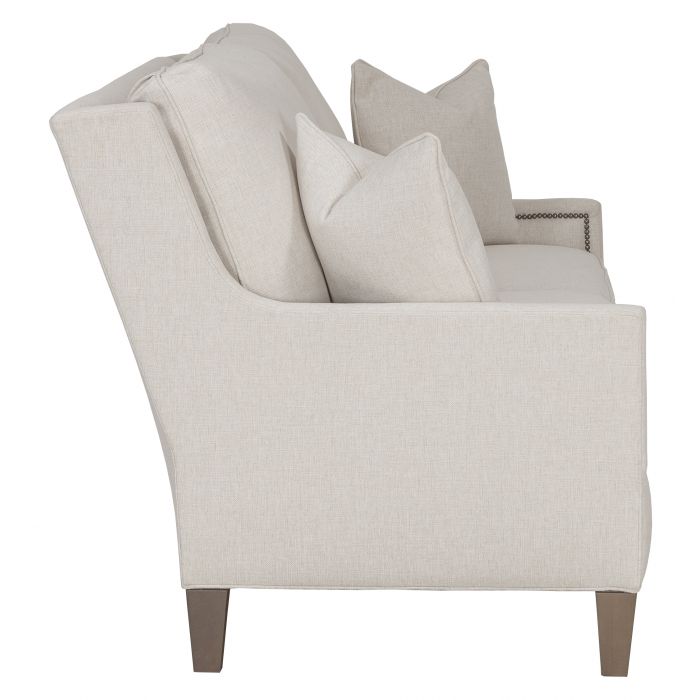 Product Description: Fairfield 2984-50 Kelly Sofa with Tapered Leg - Kelly is an upholstery series with four cushion configurations available with boxed back or knife-edge back cushions and your choice of skirt or tapered leg with finish options. Kelly frames are standard with small nail head trim, available in multiple finish options around the inside arm of the sofas and chairs.