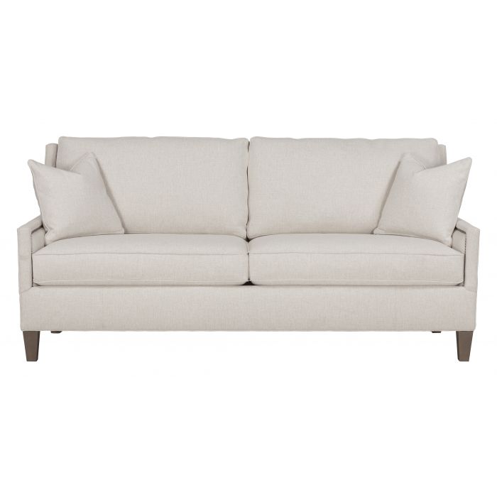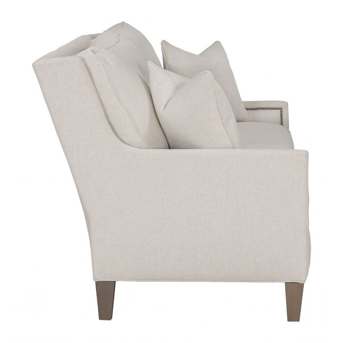 Product Description: Fairfield 2986-50 Kelly Sofa with Tapered Leg - Kelly is an upholstery series with four cushion configurations available with boxed back or knife-edge back cushions and your choice of skirt or tapered leg with finish options. Kelly frames are standard with small nail head trim, available in multiple finish options around the inside arm of the sofas and chairs.